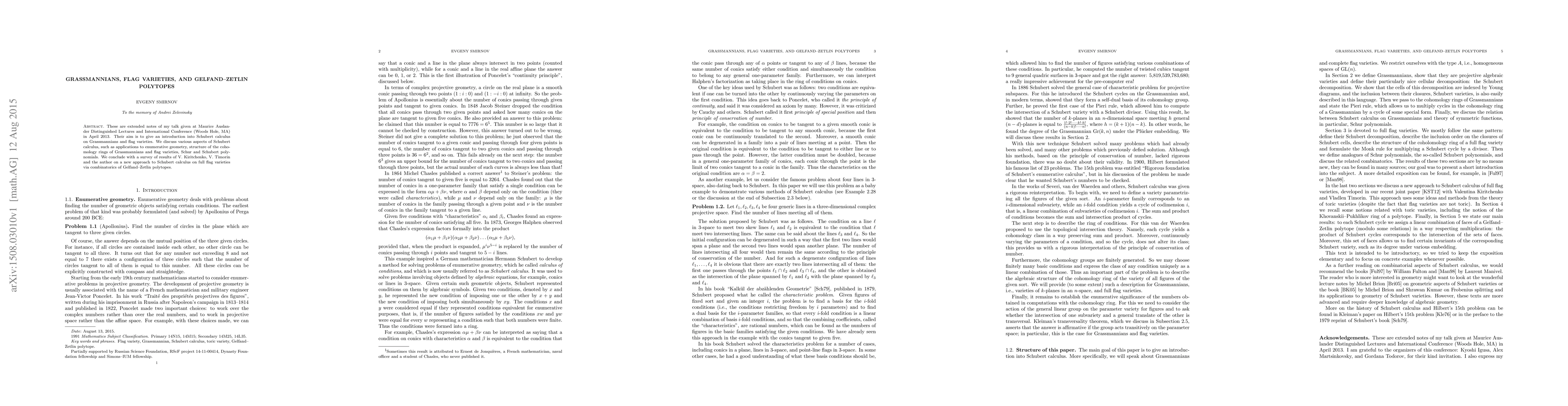 This paper provides an introduction to Schubert calculus on Grassmannians and flag varieties, discussing applications to enumerative geometry and the structure of cohomology rings, along with Schur and Schubert polynomials. It concludes with a survey of recent combinatorial approaches to Schubert calculus using Gelfand-Zetlin polytopes.