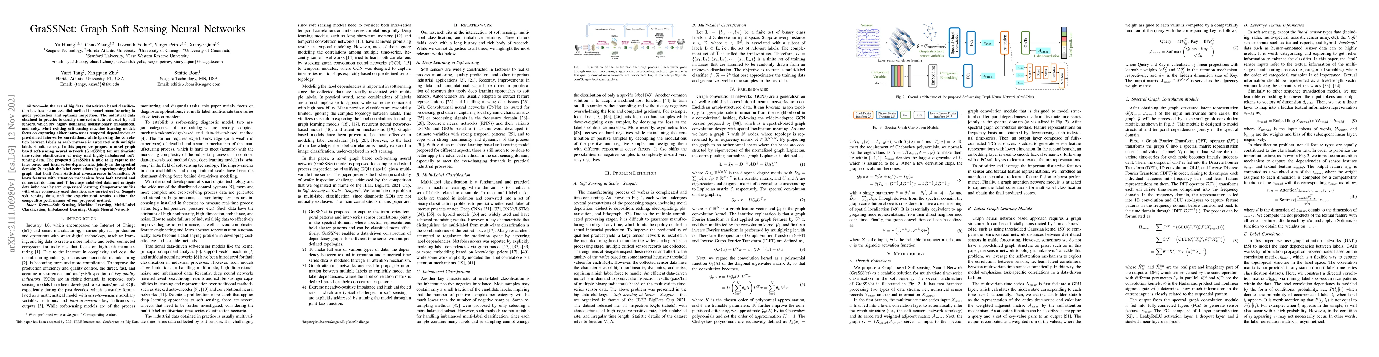 The paper proposes GraSSNet, a graph-based soft-sensing neural network for multivariate time-series classification of noisy and highly imbalanced soft-sensing data. It captures inter-series and intra-series dependencies jointly in the spectral domain, exploits label correlations via a label graph, learns features with an attention mechanism from both textual and numerical domains, and leverages unlabeled data through semi-supervised learning.