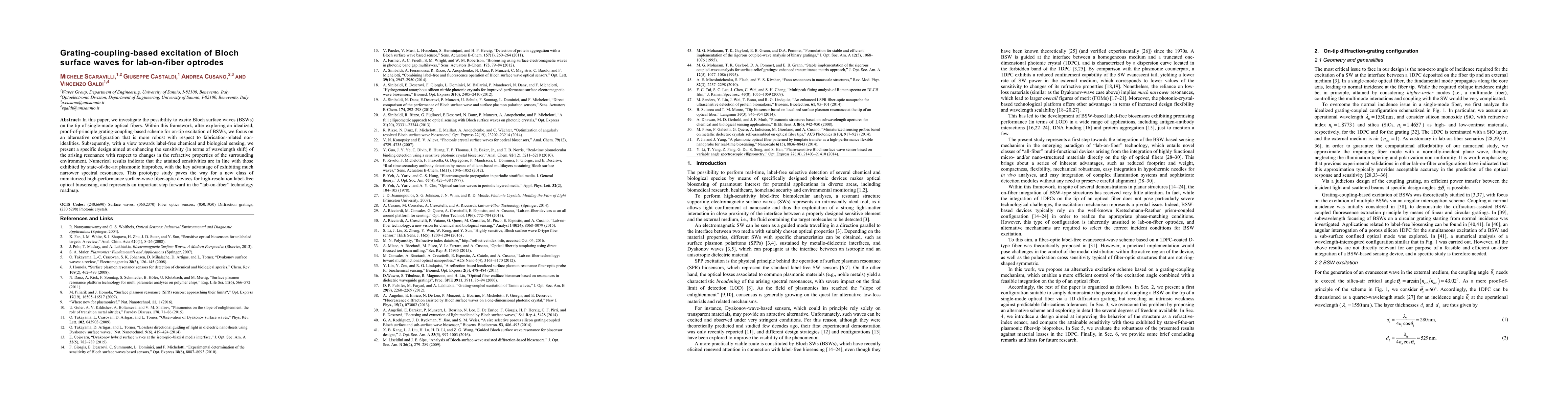 In this paper, we investigate the possibility to excite Bloch surface waves (BSWs) on the tip of single-mode optical fibers. Within this framework, after exploring an idealized, proof-of-principle grating-coupling-based scheme for on-tip excitation of BSWs, we focus on an alternative configuration that is more robust with respect to fabrication-related non-idealities. Subsequently, with a view towards label-free chemical and biological sensing, we present a specific design aimed at enhancing the sensitivity (in terms of wavelength shift) of the arising resonance with respect to changes in the refractive properties of the surrounding environment. Numerical results indicate that the attained sensitivities are in line with those exhibited by state-of-the-art plasmonic bioprobes, with the key advantage of exhibiting much narrower spectral resonances. This prototype study paves the way for a new class of miniaturized high-performance surface-wave fiber-optic devices for high-resolution label-free optical biosensing, and represents an important step forward in the "lab-on-fiber" technology roadmap.