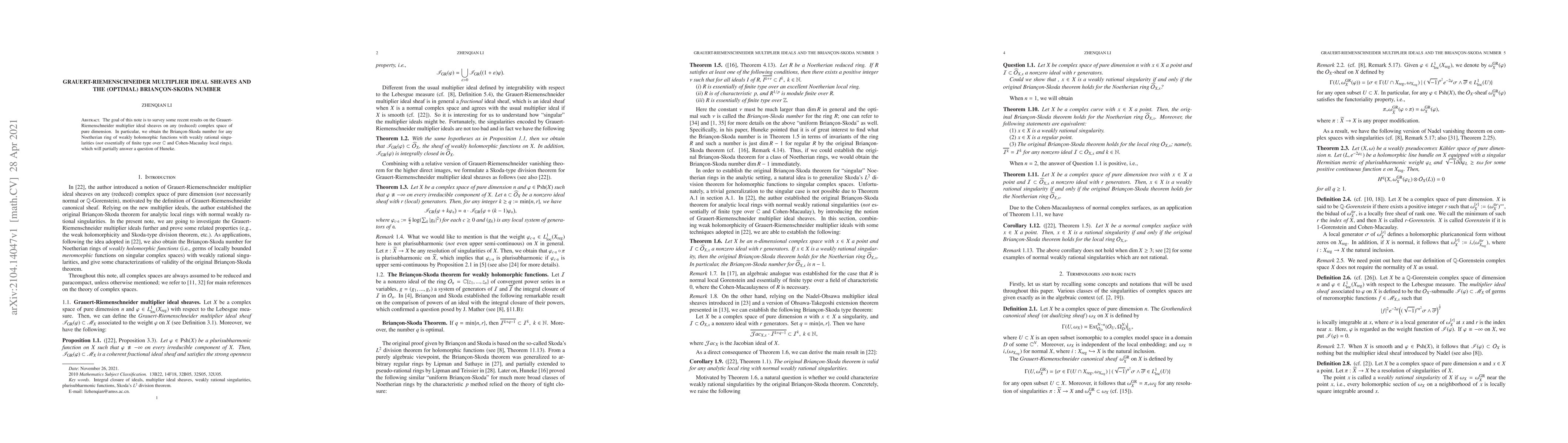 The goal of this note is to survey some recent results on the Grauert-Riemenschneider multiplier ideal sheaves on any (reduced) complex space of pure dimension. In particular, we obtain the Brian\c{c}on-Skoda number for any Noetherian ring of weakly holomorphic functions with weakly rational singularities (\emph{not} essentially of finite type over $\mathbb{C}$ and Cohen-Macaulay local rings), which will partially answer a question of Huneke.