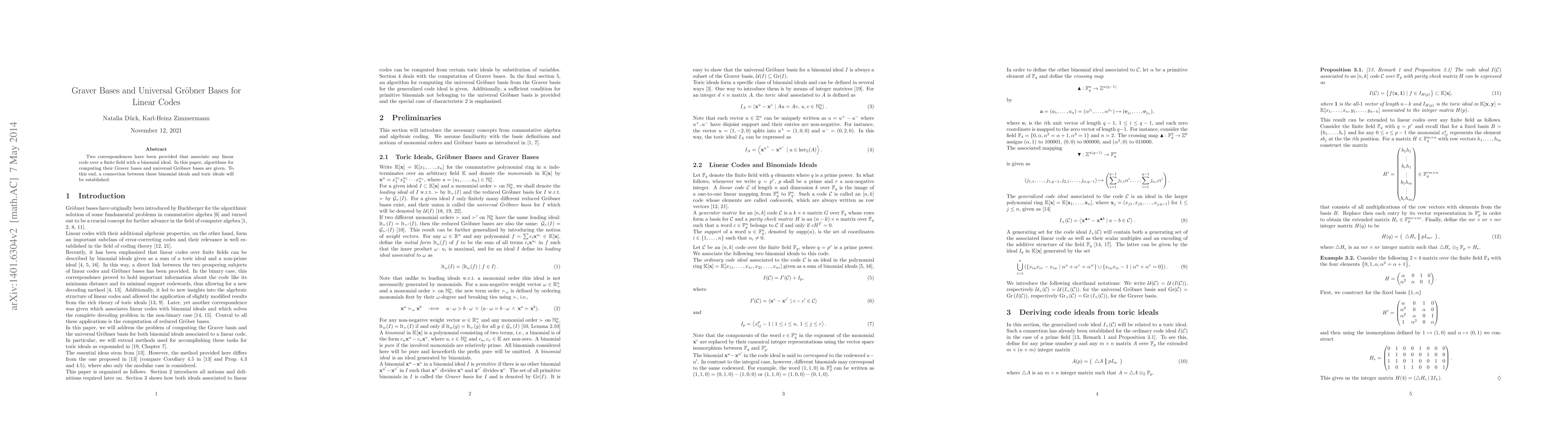 This paper presents algorithms to compute Graver bases and universal Gröbner bases for linear codes over finite fields by establishing a connection between binomial ideals and toric ideals. These computational tools facilitate the analysis of linear codes through their associated binomial ideals.