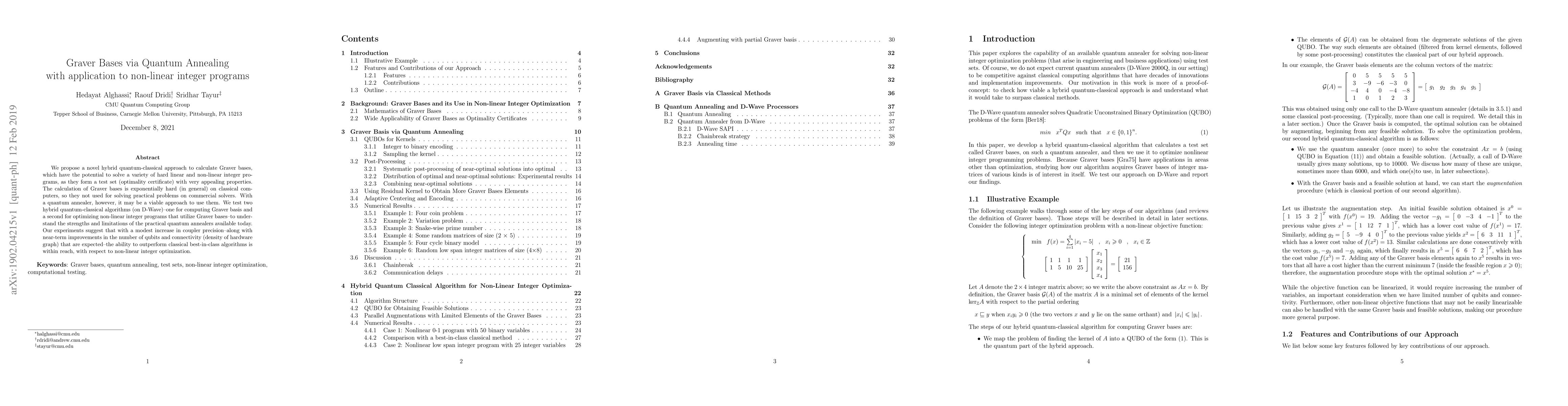 We propose a novel hybrid quantum-classical approach to calculate Graver bases, which have the potential to solve a variety of hard linear and non-linear integer programs, as they form a test set (optimality certificate) with very appealing properties. The calculation of Graver bases is exponentially hard (in general) on classical computers, so they not used for solving practical problems on commercial solvers. With a quantum annealer, however, it may be a viable approach to use them. We test two hybrid quantum-classical algorithms (on D-Wave)--one for computing Graver basis and a second for optimizing non-linear integer programs that utilize Graver bases--to understand the strengths and limitations of the practical quantum annealers available today. Our experiments suggest that with a modest increase in coupler precision--along with near-term improvements in the number of qubits and connectivity (density of hardware graph) that are expected--the ability to outperform classical best-in-class algorithms is within reach, with respect to non-linear integer optimization.