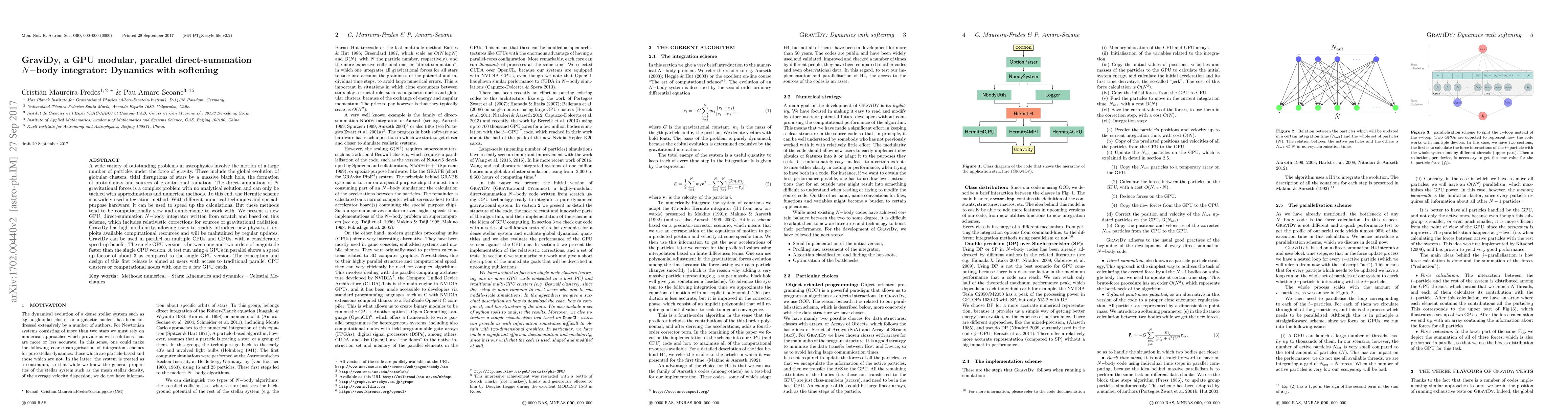 The paper introduces GraviDy, a GPU-based, modular, parallel direct-summation $N-$body integrator for gravitational dynamics, which significantly speeds up calculations compared to traditional CPU methods. The code is designed for high performance and scalability, achieving up to 200 times faster performance on a single GPU and further speedups with parallel GPU usage.
