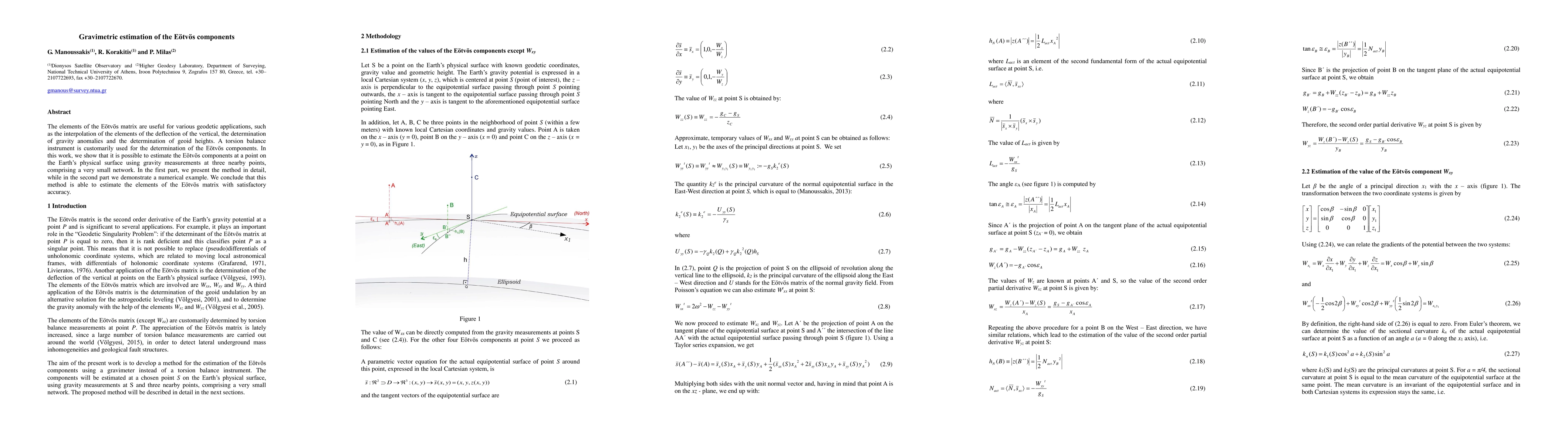 The elements of the E\"otv\"os matrix are useful for various geodetic applications, such as the interpolation of the elements of the deflection of the vertical, the determination of gravity anomalies and the determination of geoid heights. A torsion balance instrument is customarily used for the determination of the E\"otv\"os components. In this work, we show that it is possible to estimate the E\"otv\"os components, at a point on the physical surface of the Earth, using gravity measurements at three nearby points, comprising a very small network. In the first part, we present the method in detail, while in the second part we demonstrate a numerical example. We conclude that this method is able to estimate the elements of the E\"otv\"os matrix with satisfactory accuracy.