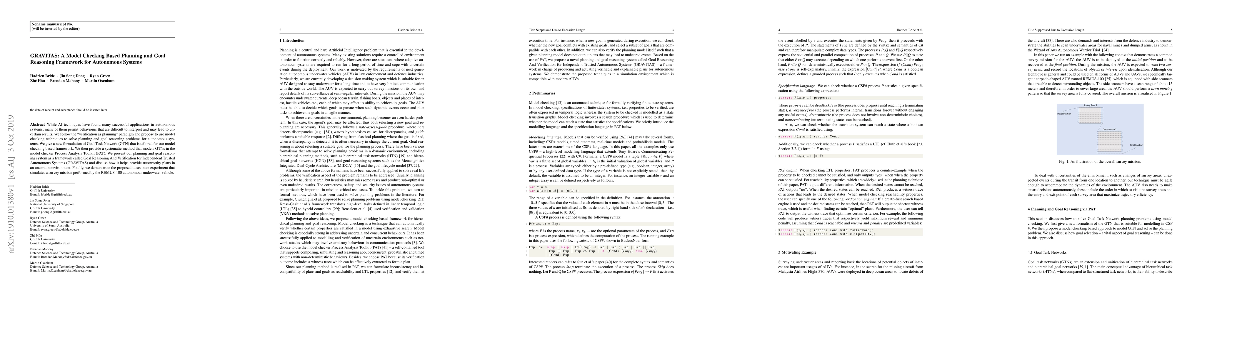 The paper introduces GRAVITAS, a framework using model checking for planning and goal reasoning in autonomous systems to ensure interpretability and reliability. It presents a new Goal Task Network formulation and a method to implement it in the PAT model checker, demonstrating its effectiveness through a survey mission simulation with the REMUS-100 autonomous underwater vehicle.