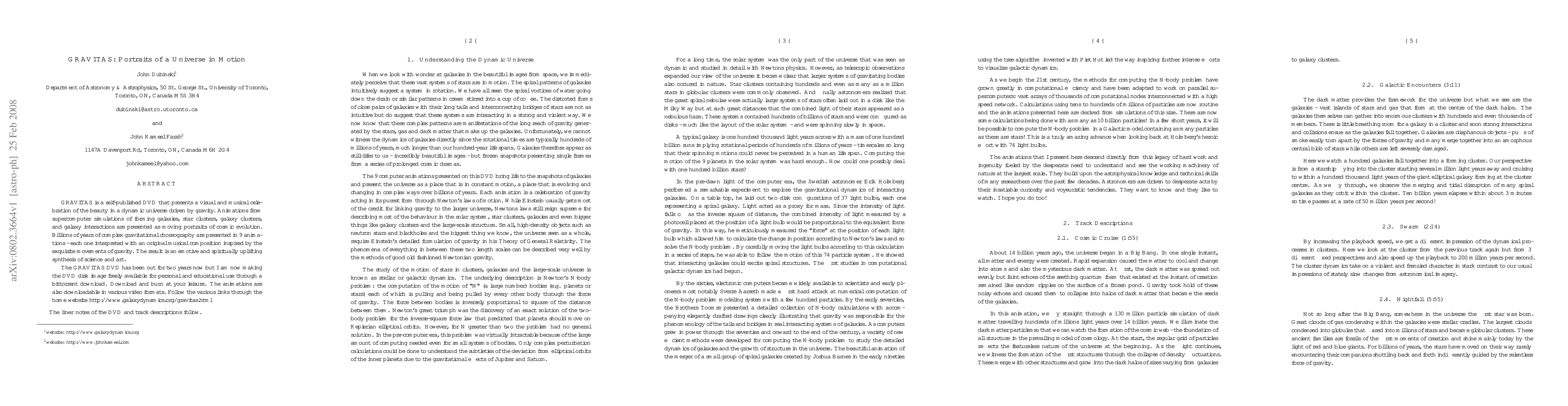 GRAVITAS is a self-published DVD that presents a visual and musical celebration of the beauty in a dynamic universe driven by gravity. Animations from supercomputer simulations of forming galaxies, star clusters, galaxy clusters, and galaxy interactions are presented as moving portraits of cosmic evolution. Billions of years of complex gravitational choreography are presented in 9 animations - each one interpreted with an original musical composition inspired by the exquisite movements of gravity. The result is an emotive and spiritually uplifting synthesis of science and art. The GRAVITAS DVD has been out for two years now but I am now making the DVD disk image freely available for personal and educational use through a bittorrent download. Download and burn at your leisure. The animations are also downloadable in various video formats.
