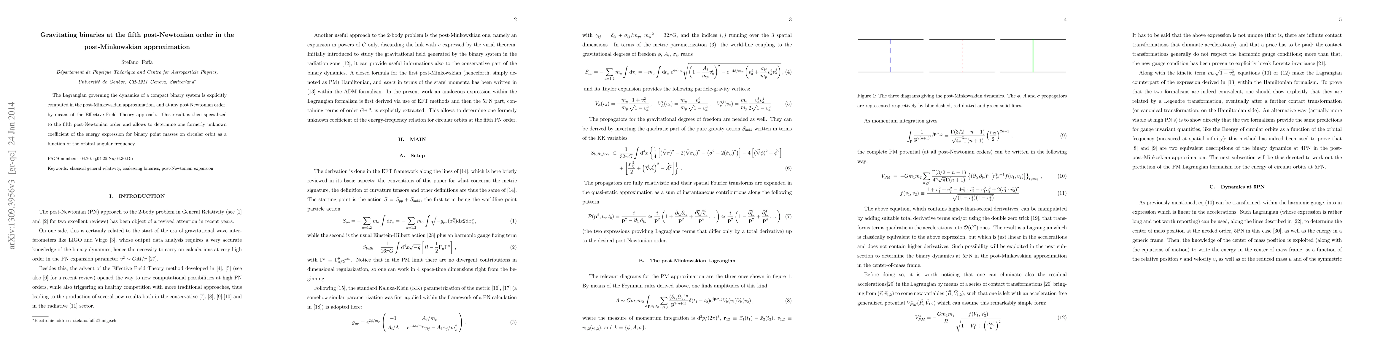 The energy of a compact binary system at the fifth post-Newtonian order is explicitly computed in the post-Minkowskian approximation by means of the Effective Field Theory approach. This result allows to determine, for the first time beyond the test particle limit, one coefficient of the energy expression for binary point masses on circular orbit as a function of the orbital angular frequency.