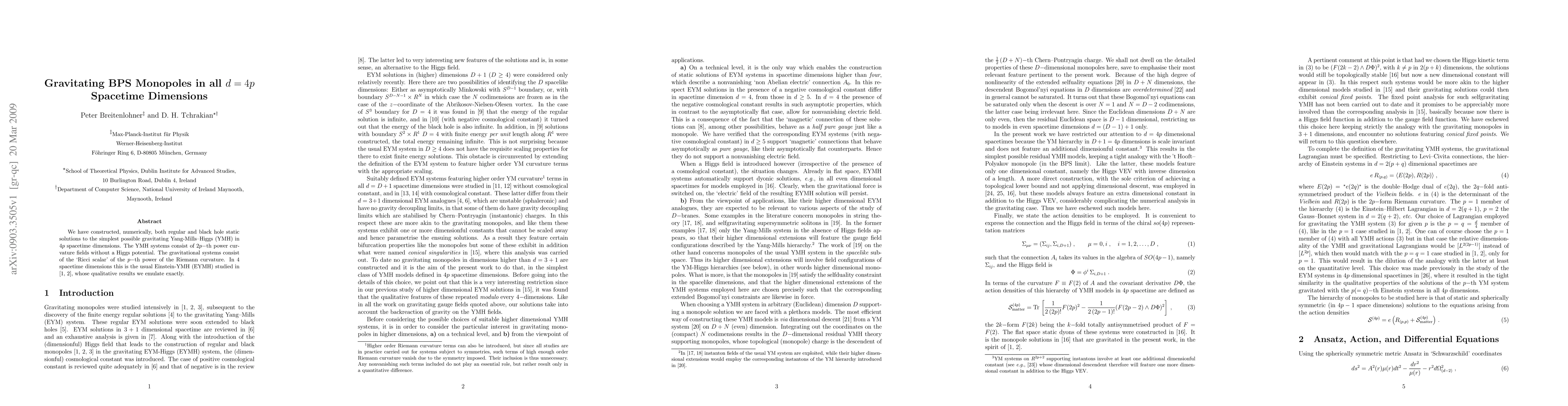 We have constructed, numerically, both regular and black hole static solutions to the simplest possible gravitating Yang-Mills--Higgs (YMH) in $4p$ spacetime dimensions. The YMH systems consist of $2p-$th power curvature fields without a Higgs potential. The gravitational systems consist of the `Ricci scalar' of the $p-$th power of the Riemann curvature. In 4 spacetime dimensions this is the usual Einstein-YMH (EYMH) studied in \cite{Breitenlohner:1991aa, Breitenlohner:1994di}, whose qualitative results we emulate exactly.