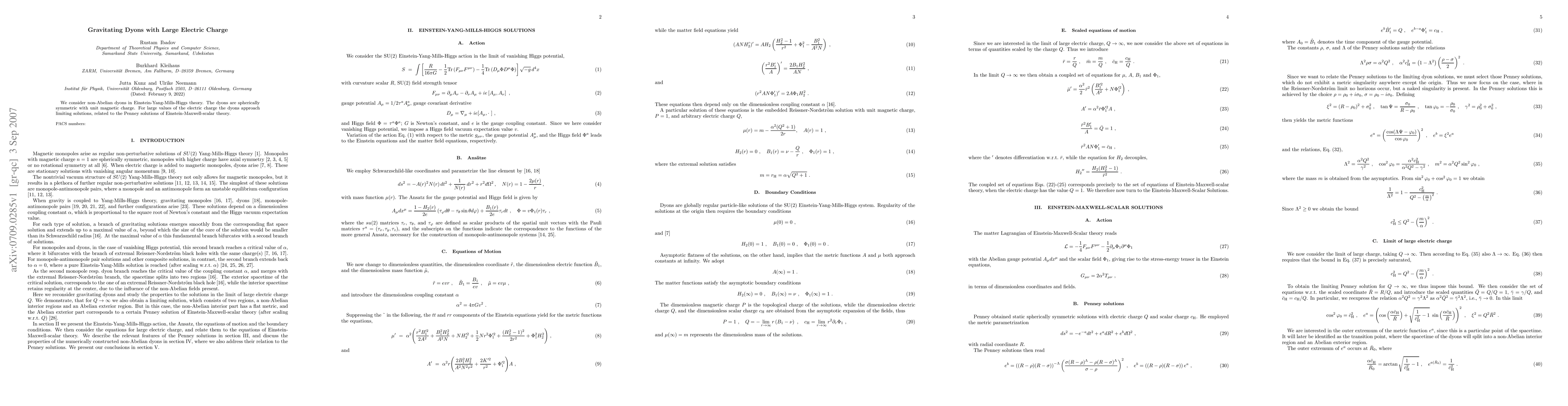 Summary: This study examines non-Abelian dyons in Einstein-Yang-Mills-Higgs theory, revealing that for large electric charges, these spherically symmetric objects tend towards limiting solutions akin to the Penney solutions in Einstein-Maxwell-scalar theory.