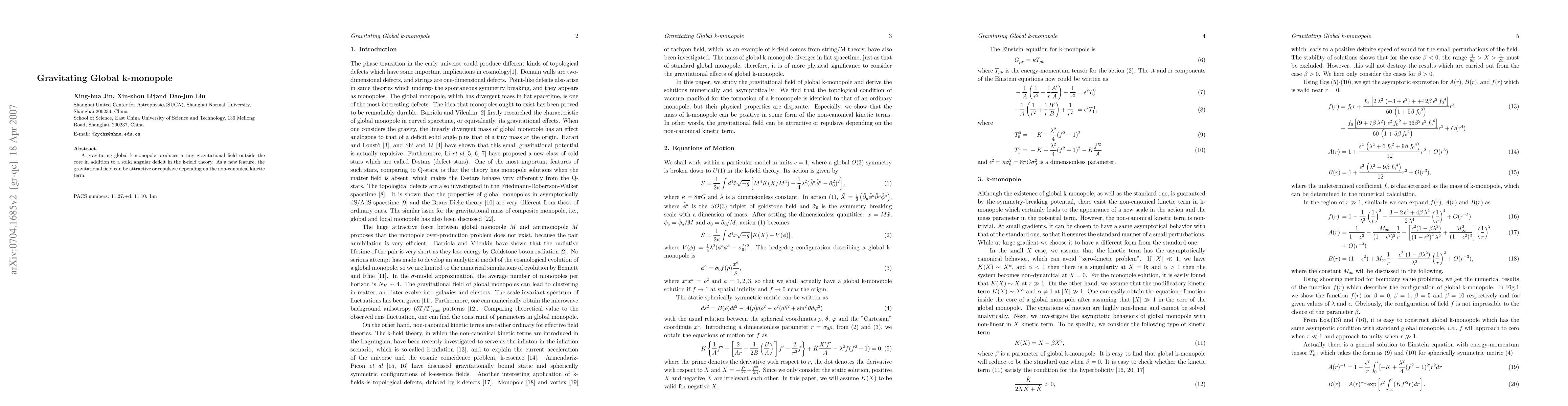 This research explores gravitating global k-monopoles, which create a gravitational field outside their core and exhibit a solid angular deficit in the k-field theory. Notably, the gravitational field can either attract or repel depending on the non-canonical kinetic term.