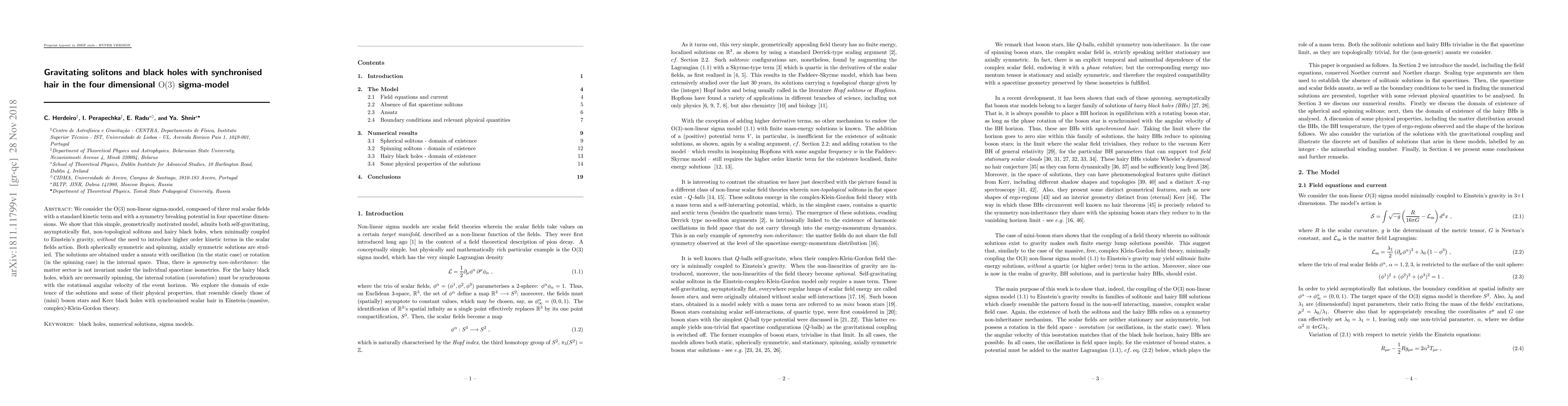 We consider the $\mathrm{O}(3)$ non-linear sigma-model, composed of three real scalar fields with a standard kinetic term and with a symmetry breaking potential in four spacetime dimensions. We show that this simple, geometrically motivated model, admits both self-gravitating, asymptotically flat, non-topological solitons and hairy black holes, when minimally coupled to Einstein's gravity, $without$ the need to introduce higher order kinetic terms in the scalar fields action. Both spherically symmetric and spinning, axially symmetric solutions are studied. The solutions are obtained under a ansatz with oscillation (in the static case) or rotation (in the spinning case) in the internal space. Thus, there is symmetry non-inheritance: the matter sector is not invariant under the individual spacetime isometries. For the hairy black holes, which are necessarily spinning, the internal rotation (isorotation) must be synchronous with the rotational angular velocity of the event horizon. We explore the domain of existence of the solutions and some of their physical properties, that resemble closely those of (mini) boson stars and Kerr black holes with synchronised scalar hair in Einstein-(massive, complex)-Klein-Gordon theory.