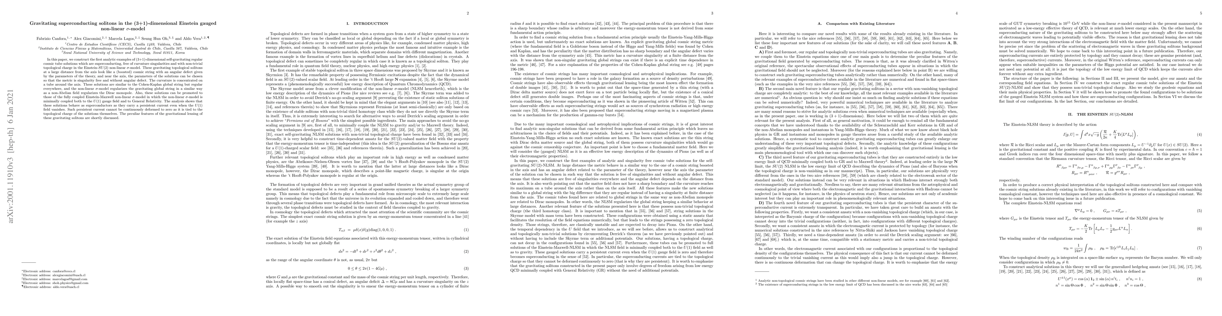 This paper presents the first analytic examples of self-gravitating superconducting solitons in a (3+1)-dimensional Einstein-SU(2) non-linear sigma-model, which are regular, singularity-free, and exhibit persistent current tied to their topological charge. These solutions resemble boosted cosmic strings and can be extended to the coupled Einstein-Maxwell non-linear sigma-model.