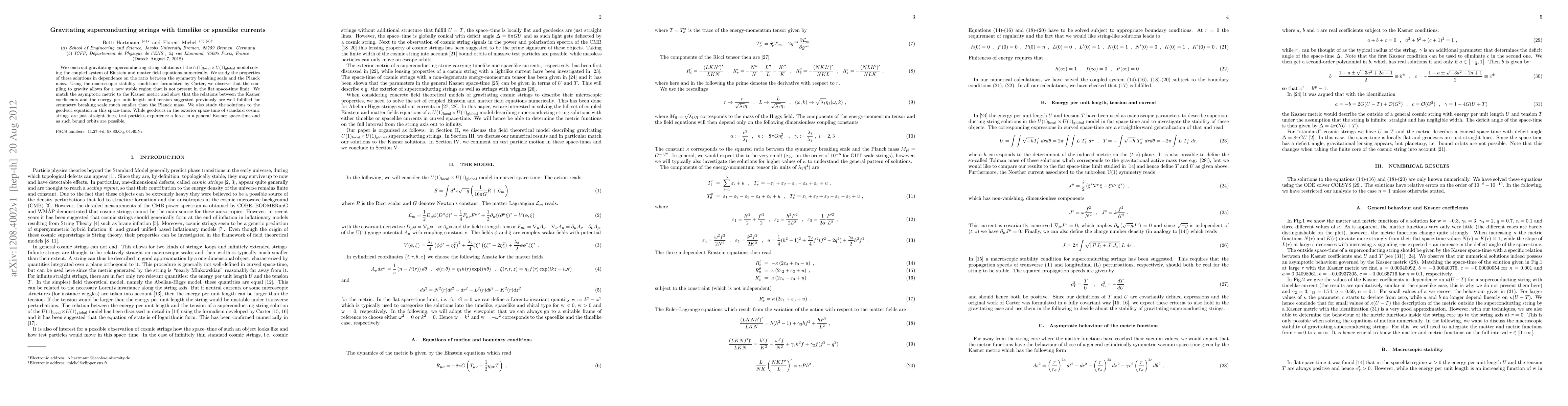 We construct gravitating superconducting string solutions of the U(1)_{local} x U(1)_{global} model solving the coupled system of Einstein and matter field equations numerically. We study the properties of these solutions in dependence on the ratio between the symmetry breaking scale and the Planck mass. Using the macroscopic stability conditions formulated by Carter, we observe that the coupling to gravity allows for a new stable region that is not present in the flat space-time limit. We match the asymptotic metric to the Kasner metric and show that the relations between the Kasner coefficients and the energy per unit length and tension suggested previously are well fulfilled for symmetry breaking scale much smaller than the Planck mass. We also study the solutions to the geodesic equation in this space-time. While geodesics in the exterior space-time of standard cosmic strings are just straight lines, test particles experience a force in a general Kasner space-time and as such bound orbits are possible.