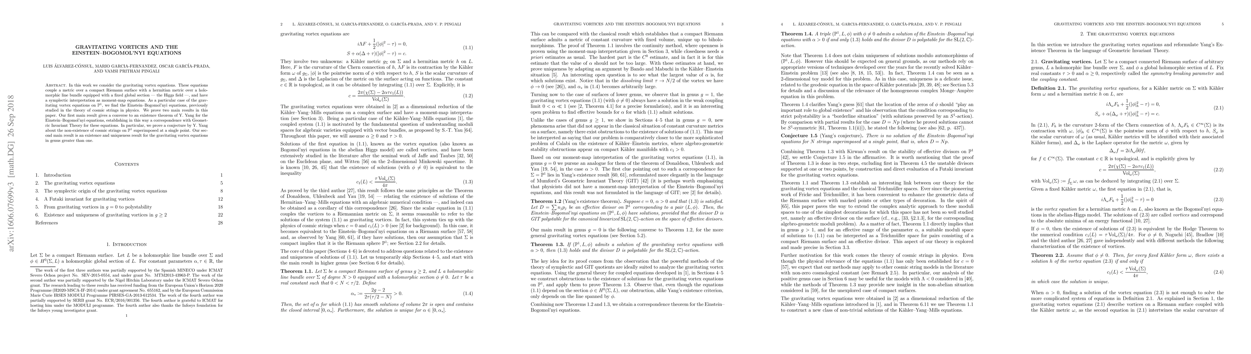Researchers investigate gravitating vortices on Riemann surfaces, proving a converse to an existence theorem for the Einstein-Bogomol'nyi equations and establishing correspondence with Geometric Invariant Theory.