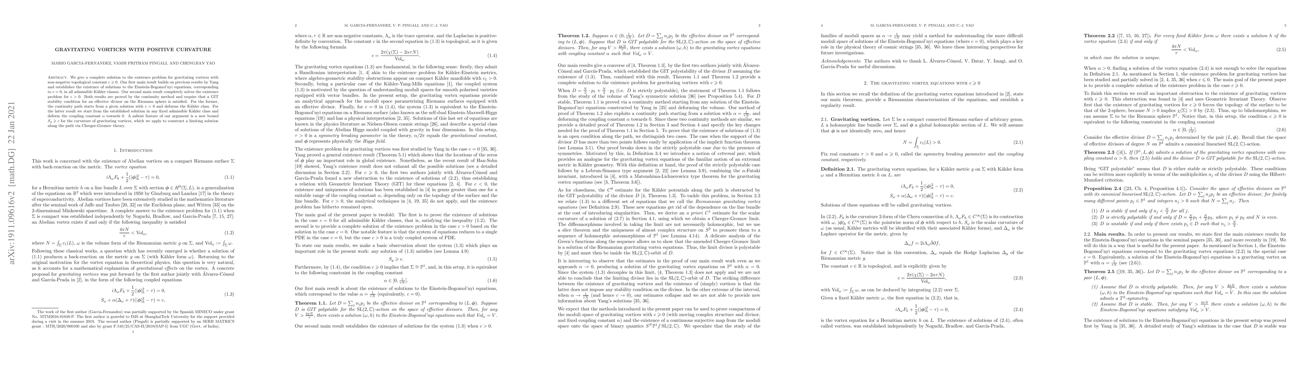 Researchers solve the existence problem for gravitating vortices with positive curvature, proving solutions exist in all admissible K"ahler classes for non-negative topological constant c >= 0.