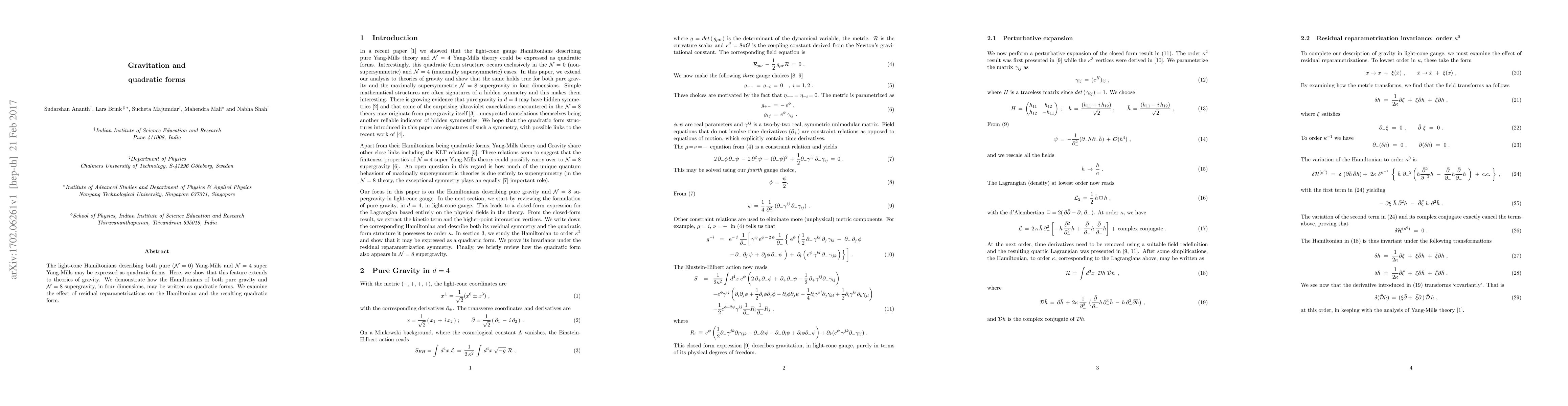 The light-cone Hamiltonians describing both pure Yang-Mills and N=4 super Yang-Mills may be expressed as quadratic forms. Here, we show that this feature extends to theories of gravity. We demonstrate how the Hamiltonians of both pure gravity and N=8 supergravity, in four dimensions, may be written as quadratic forms. We examine the effect of residual reparametrizations on the Hamiltonian and the resulting quadratic form.