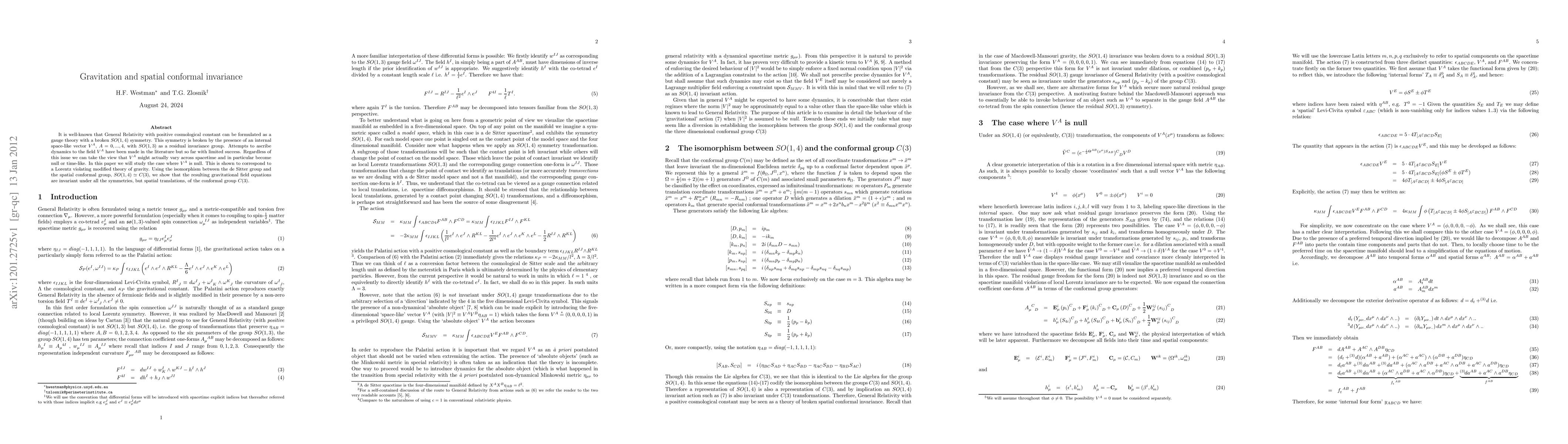 The paper introduces Cartan Conformal Gravity, an action that maintains invariance under the conformal group C(3), excluding spatial translations, offering a novel interpretation of gravitational behavior in terms of spatial rather than spacetime structure.