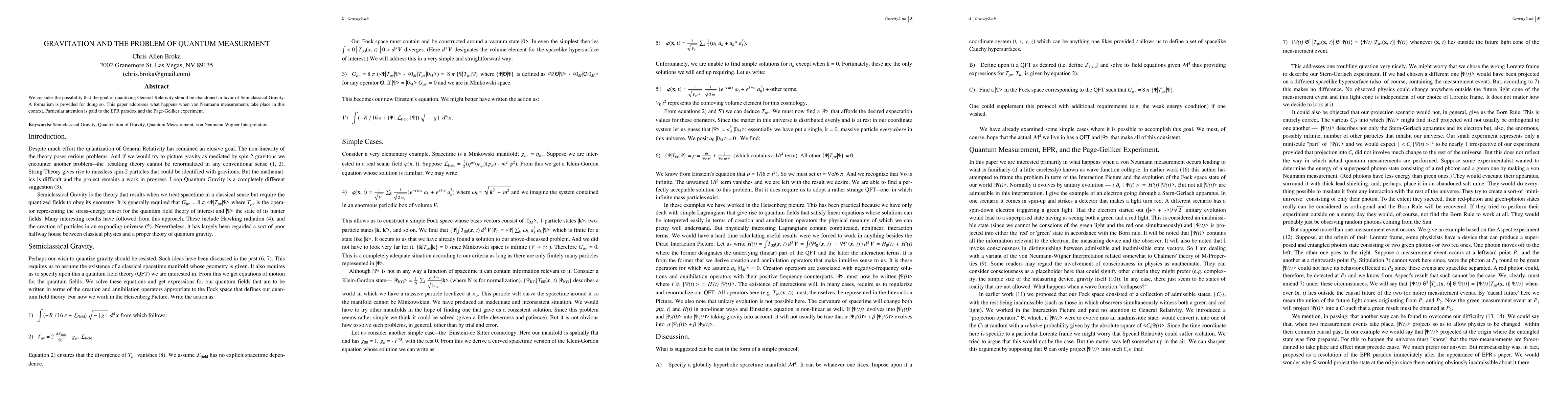 We consider the possibility that the goal of quantizing General Relativity should be abandoned in favor of Semiclassical Gravity. A formalism is provided for doing so. The quantum measurement problem is investigated in this context. The 'particle' concept is examined and clarified.