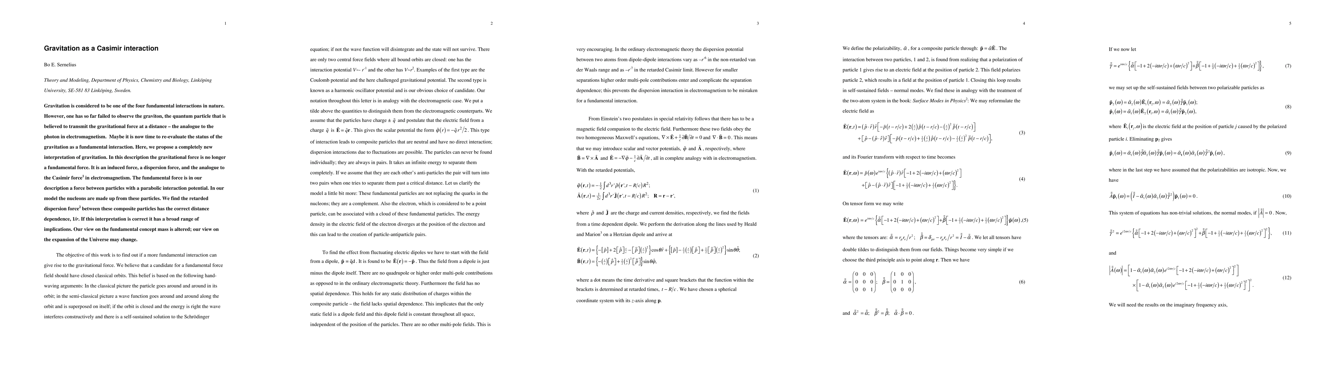 Gravitation is considered to be one of the four fundamental interactions in nature. However, one has so far failed to observe the graviton, the quantum particle that is believed to transmit the gravitational force at a distance - the analogue to the photon in electromagnetism. Maybe it is now time to re-evaluate the status of the gravitation as a fundamental interaction. Here, we propose a completely new interpretation of gravitation. In this description the gravitational force is no longer a fundamental force. It is an induced force, a dispersion force, and the analogue to the Casimir force in electromagnetism. The fundamental force is in our description a force between particles with a parabolic interaction potential. In our model the nucleons are made up from these particles. We find the retarded dispersion force between these composite particles has the correct distance dependence, 1/r. If this interpretation is correct it has a broad range of implications. Our view on the fundamental concept mass is altered; our view on the expansion of the Universe may change.