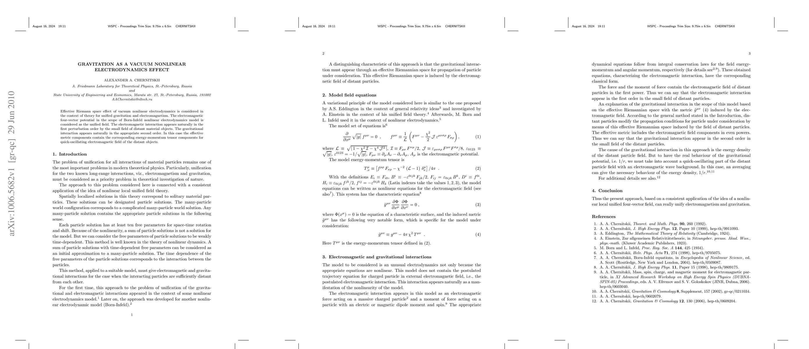 This paper explores how vacuum nonlinear electrodynamics can unify gravitation and electromagnetism, proposing that gravitational effects arise from the electromagnetic four-vector potential in the Born-Infeld model, with gravity manifesting in the second perturbation order due to the energy-momentum tensor of distant objects' oscillating electromagnetic fields.