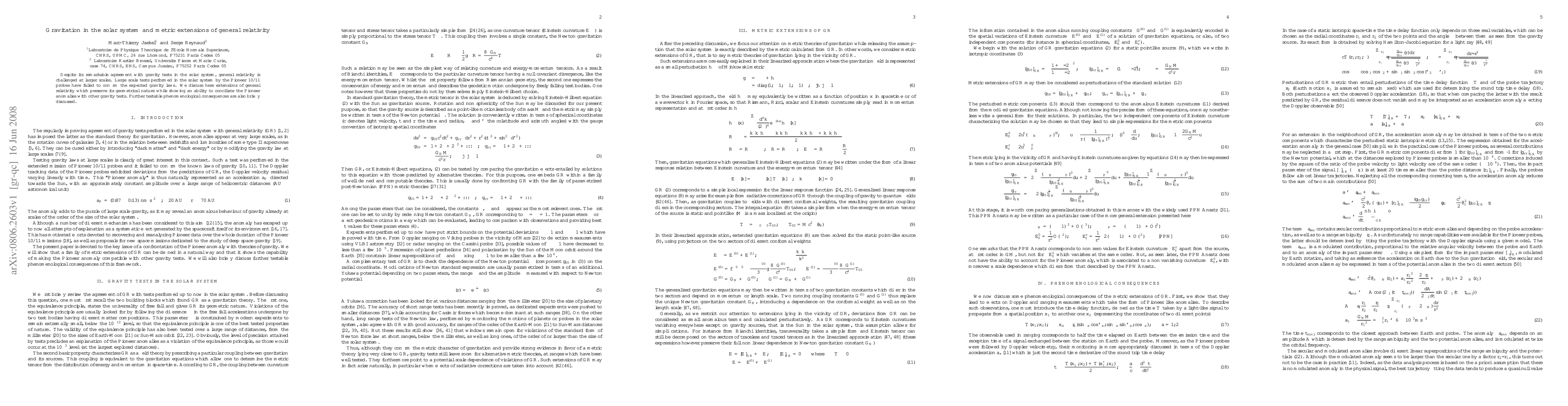 This paper explores metric extensions of general relativity to address discrepancies in solar system gravity tests, particularly the anomalies observed by Pioneer 10/11 probes, while maintaining the theory's geometrical framework and compatibility with other gravity tests. It also outlines further testable predictions of these extended models.