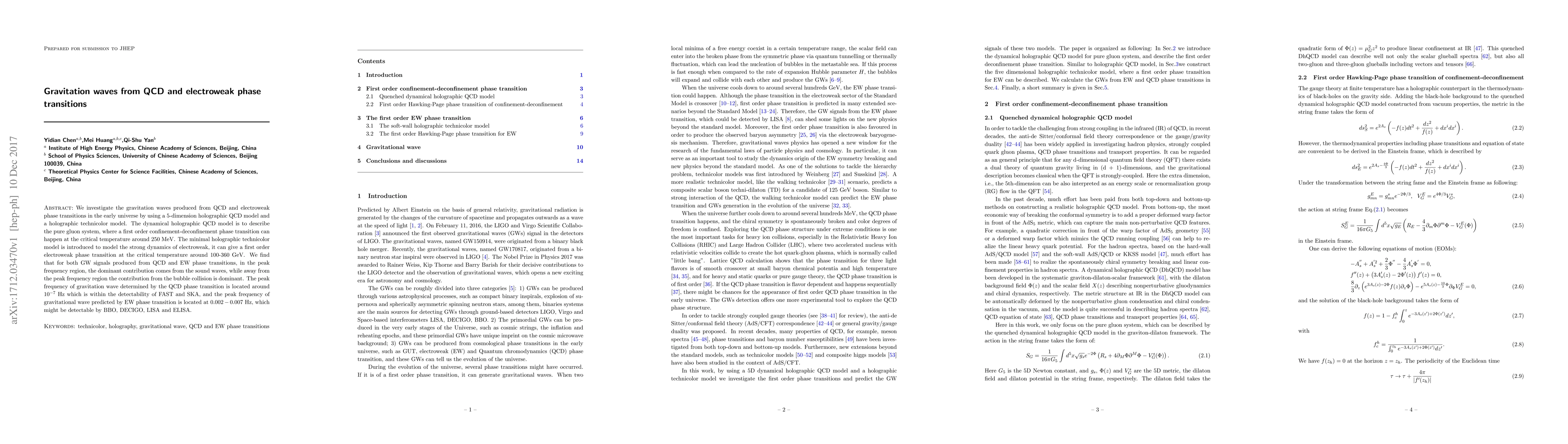 This research examines gravitational waves from QCD and electroweak phase transitions in the early universe using holographic QCD and technicolor models. It finds that peak frequencies from QCD transitions are detectable by FAST and SKA, while those from electroweak transitions could be detected by BBO, DECIGO, LISA, and ELISA.