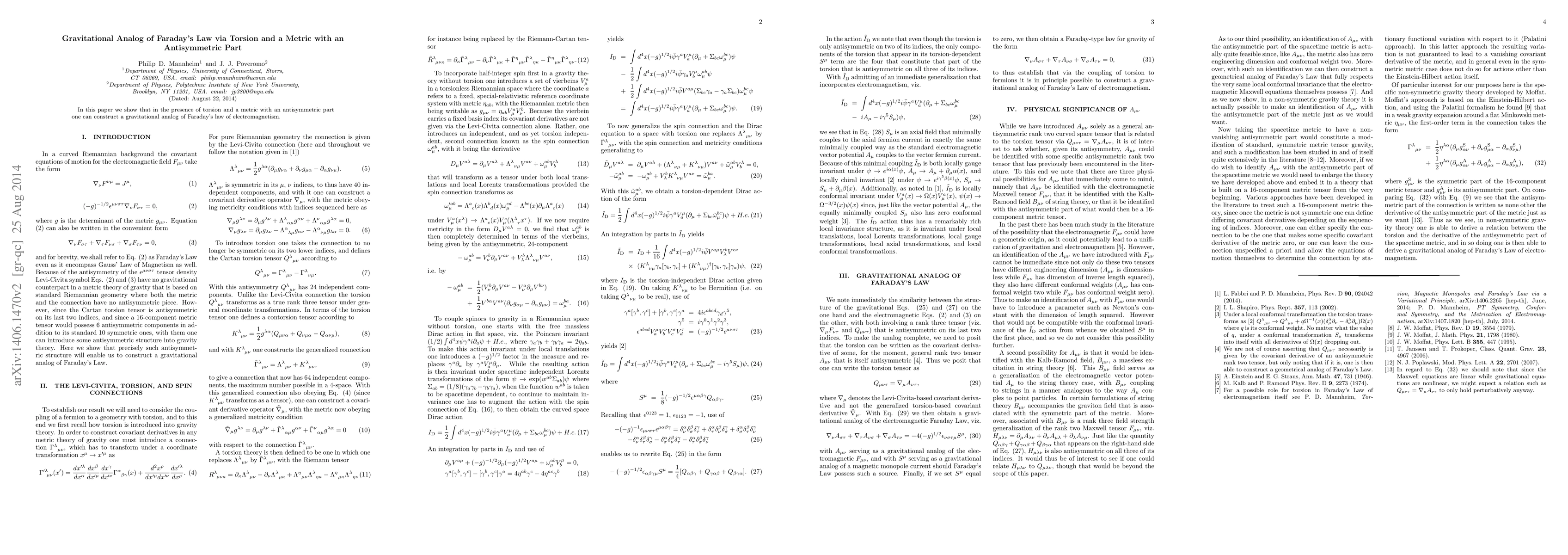 In this paper we show that in the presence of torsion and a metric with an antisymmetric part one can construct a gravitational analog of Faraday's law of electromagnetism.