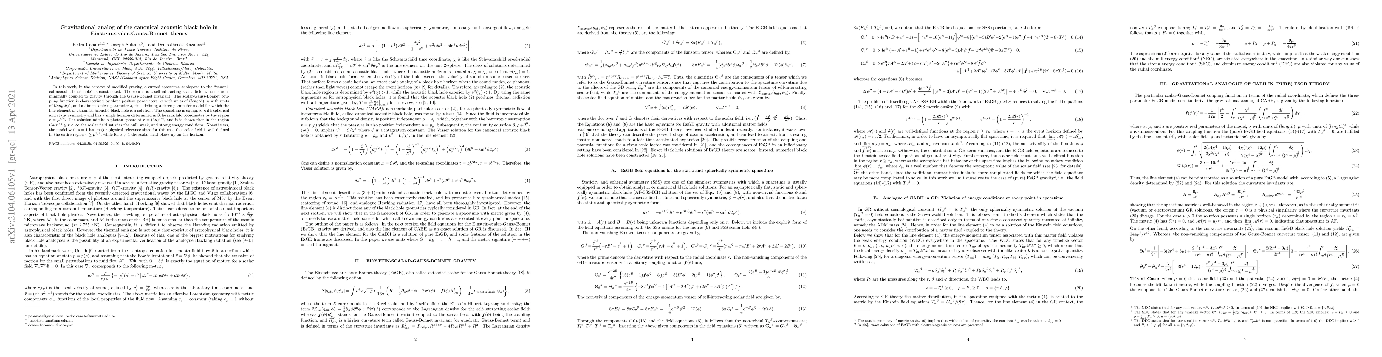 In this work, in the context of modified gravity, a curved spacetime analogous to the "canonical acoustic black hole" is constructed. The source is a self-interacting scalar field which is non-minimally coupled to gravity through the Gauss-Bonnet invariant. The scalar-Gauss-Bonnet coupling function is characterized by three positive parameters: $\sigma$ with units of $(length)$, $\mu$ with units of $(length)^{4}$, and a dimensionless parameter $s$, thus defining a three-parameter model for which the line element of canonical acoustic black hole is a solution. The spacetime is equipped with spherical and static symmetry and has a single horizon determined in Schwarzschild coordinates by the region $r=\mu^{1/4}$. The solution admits a photon sphere at $r=(3\mu)^{1/4}$, and it is shown that in the region $(3\mu)^{1/4}\leq r<\infty$ the scalar field satisfies the null, weak, and strong energy conditions. Nonetheless, the model with $s=1$ has major physical relevance since for this case the scalar field is well defined in the entire region $r\geq\mu^{1/4}$, while for $s\neq1$ the scalar field blows up on the horizon.