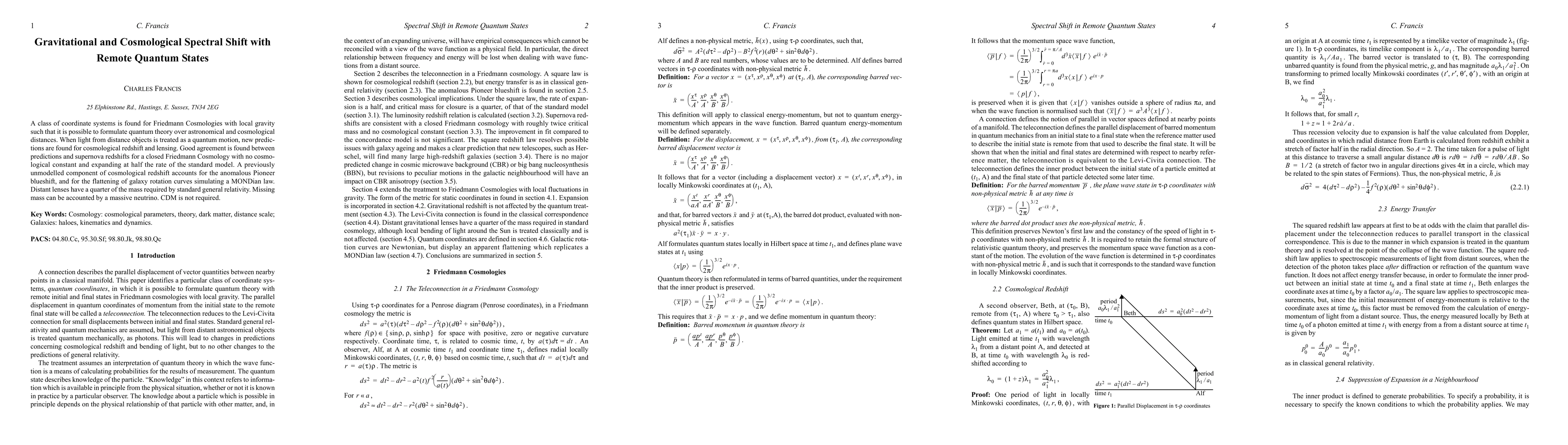 A class of coordinate systems is found for Friedmann Cosmologies with local gravity such that it is possible to formulate quantum theory over astronomical and cosmological distances. When light from distance objects is treated as a quantum motion, new predictions are found for cosmological redshift and lensing. Good agreement is found between predictions and supernova redshifts for a closed Friedmann Cosmology with no cosmological constant and expanding at half the rate of the standard model. A previously unmodelled component of cosmological redshift accounts for the anomalous Pioneer blueshift, and for the flattening of galaxy rotation curves simulating a MONDian law. Distant lenses have a quarter of the mass required by standard general relativity. Missing mass can be accounted by a massive neutrino. CDM is not required.