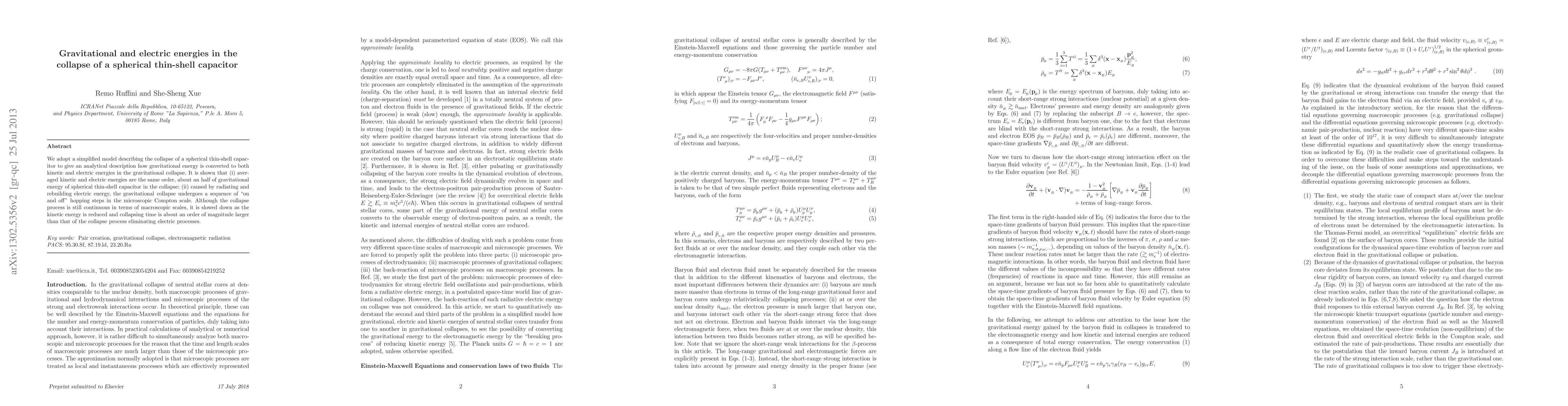 This paper analyzes the collapse of a spherical thin-shell capacitor, demonstrating that gravitational energy is converted into kinetic and electric energies, with both being roughly half the gravitational energy. The process exhibits "on and off" hopping steps due to electric energy dynamics, slowing down the collapse by an order of magnitude compared to scenarios without electric processes.