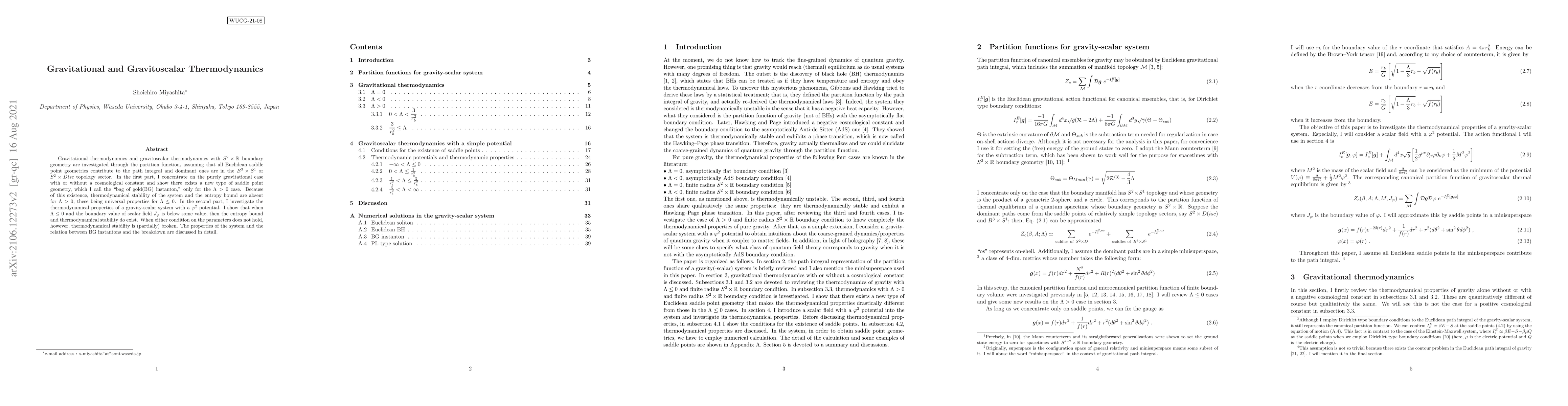 Gravitational thermodynamics and gravitoscalar thermodynamics with $S^2 \times \mathbb{R}$ boundary geometry are investigated through the partition function, assuming that all Euclidean saddle point geometries contribute to the path integral and dominant ones are in the $B^3 \times S^1$ or $S^2 \times Disc$ topology sector. In the first part, I concentrate on the purely gravitational case with or without a cosmological constant and show there exists a new type of saddle point geometry, which I call the "bag of gold(BG) instanton," only for the $\Lambda>0$ case. Because of this existence, thermodynamical stability of the system and the entropy bound are absent for $\Lambda>0$, these being universal properties for $\Lambda \leq 0$. In the second part, I investigate the thermodynamical properties of a gravity-scalar system with a $\varphi^2$ potential. I show that when $\Lambda \leq 0$ and the boundary value of scalar field $J_{\varphi}$ is below some value, then the entropy bound and thermodynamical stability do exist. When either condition on the parameters does not hold, however, thermodynamical stability is (partially) broken. The properties of the system and the relation between BG instantons and the breakdown are discussed in detail.