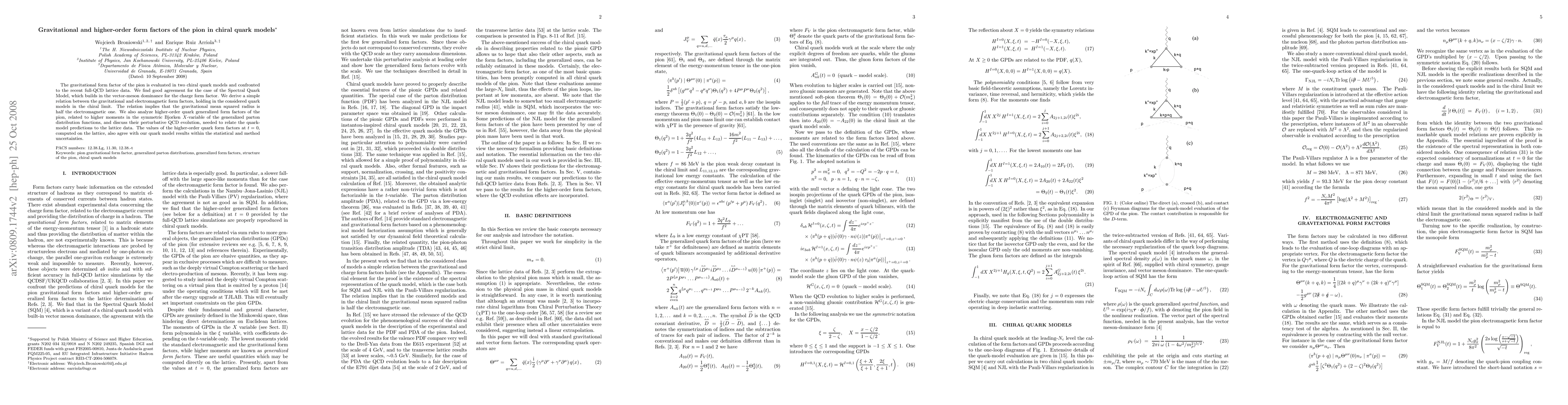 This study evaluates the gravitational form factor of the pion in two chiral quark models, finding agreement with recent full-QCD lattice data, particularly for the Spectral Quark Model. It derives a relation linking gravitational and electromagnetic form factors, implying the former's radius is half the latter's in the chiral limit. The research also examines higher-order quark generalized form factors, discussing their QCD evolution and comparing quark model predictions with lattice data, which show consistency within uncertainties.