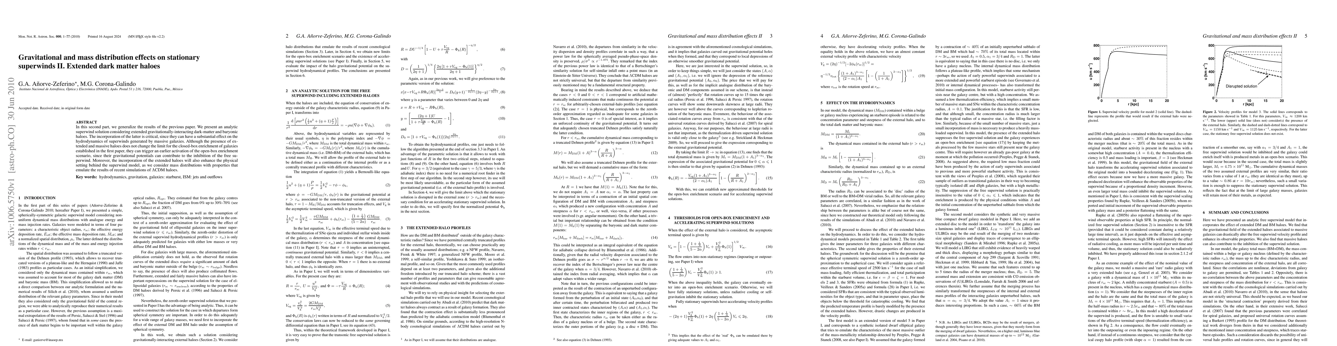 In this second part, we generalize the results of the previous paper. We present an analytic superwind solution considering extended gravitationally-interacting dark-matter and baryonic haloes. The incorporation of the latter is critical, since they can have a substantial effect on the hydrodynamics of superwinds generated by massive galaxies. Although the presence of extended and massive haloes does not change the limit for the closed-box enrichment of galaxies established in the first paper, they can trigger an earlier activation of the open-box enrichment scenario, since their gravitational potentials can contribute to the inhibition of the free superwind. Moreover, the incorporation of the extended haloes will also enhance the physical setting behind the superwind model, as we consider mass distributions with properties that emulate the results of recent simulations of $\Lambda$CDM haloes.