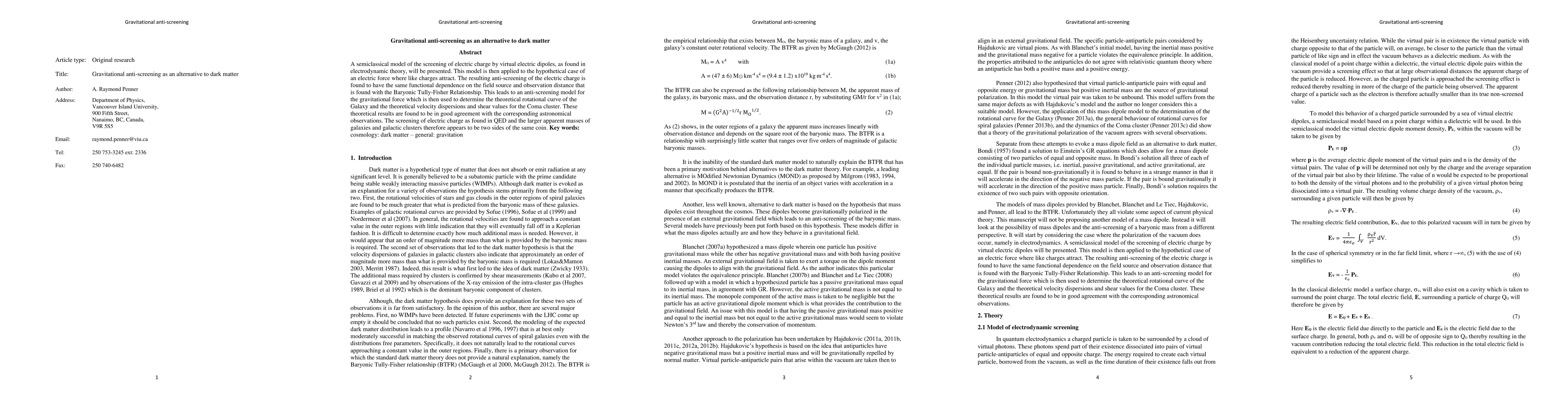 A semi-classical model of the screening of electric charge by virtual electric dipoles, as found in electrodynamic theory, will be presented. This model is then applied to the hypothetical case of an electric force where like charges attract. The resulting anti-screening of the electric charge is found to have the same functional dependence on the field source and observation distance that is found with the Baryonic Tully-Fisher Relationship. This leads to an anti-screening model for the gravitational force which is then used to determine the theoretical rotational curve of the Galaxy and the theoretical velocity dispersions and shear values for the Coma cluster. These theoretical results are found to be in good agreement with the corresponding astronomical observations. The screening of electric charge as found in QED and the larger apparent masses of galaxies and galactic clusters therefore appears to be two sides of the same coin.