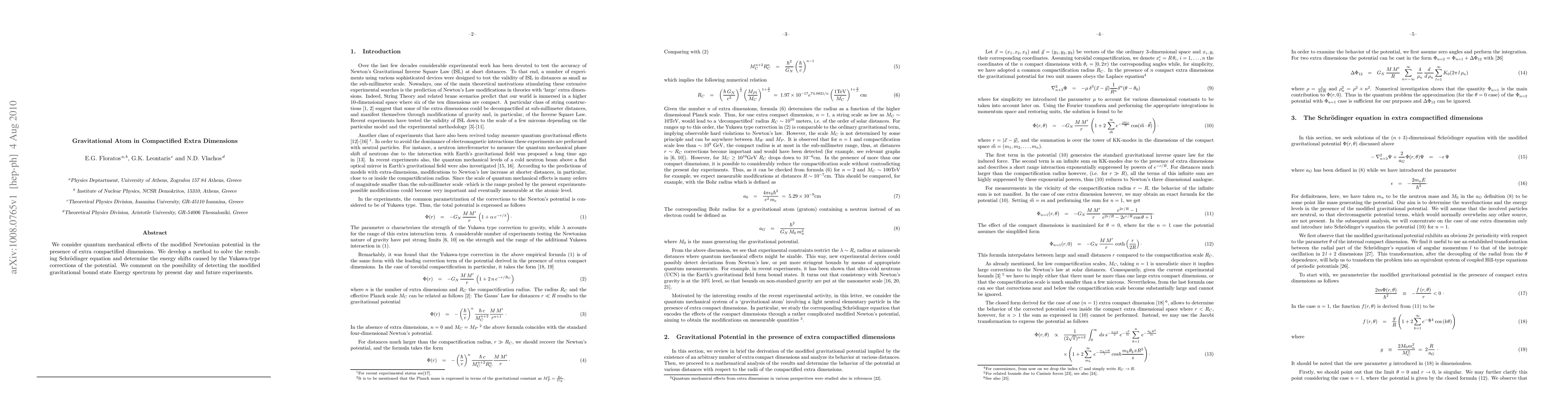 We consider quantum mechanical effects of the modified Newtonian potential in the presence of extra compactified dimensions. We develop a method to solve the resulting Schroedinger equation and determine the energy shifts caused by the Yukawa-type corrections of the potential. We comment on the possibility of detecting the modified gravitational bound state Energy spectrum by present day and future experiments.
