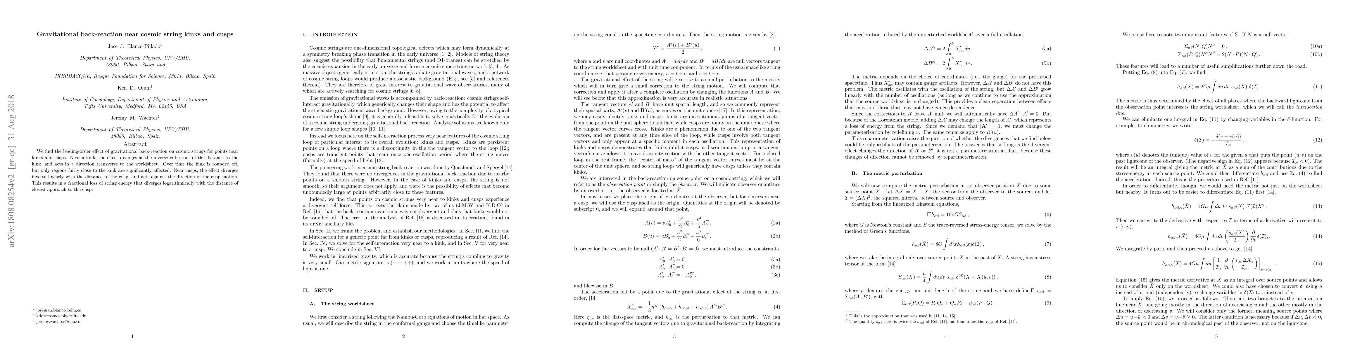 We find the leading-order effect of gravitational back-reaction on cosmic strings for points near kinks and cusps. Near a kink, the effect diverges as the inverse cube root of the distance to the kink, and acts in a direction transverse to the worldsheet. Over time the kink is rounded off, but only regions fairly close to the kink are significantly affected. Near cusps, the effect diverges inverse linearly with the distance to the cusp, and acts against the direction of the cusp motion. This results in a fractional loss of string energy that diverges logarithmically with the distance of closest approach to the cusp.
