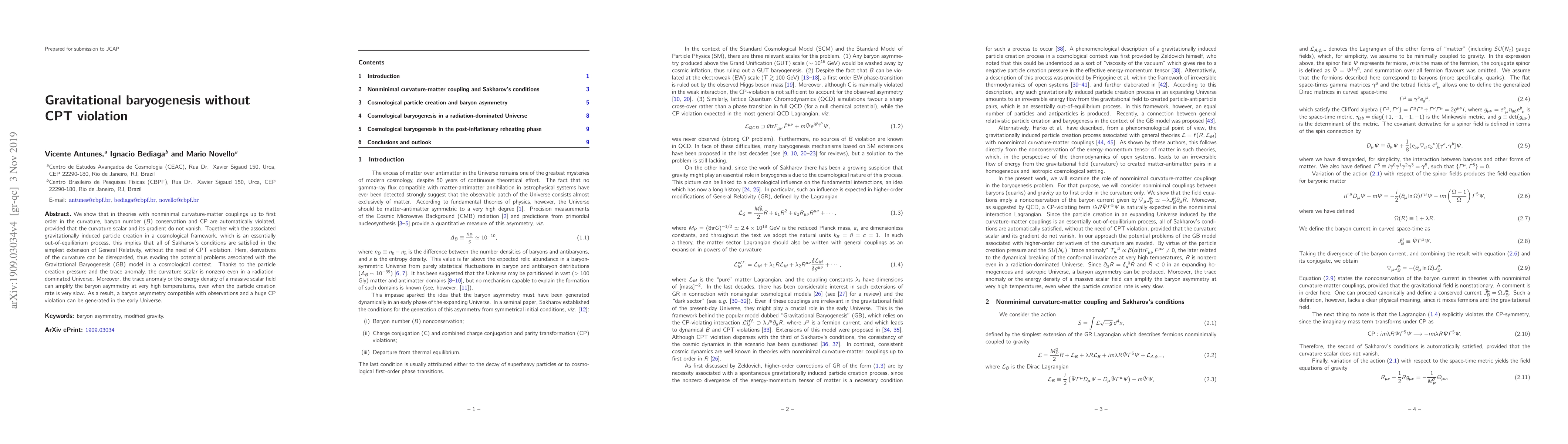 This paper demonstrates that gravitational baryogenesis can occur without CPT violation through nonminimal curvature-matter couplings, satisfying all Sakharov conditions in an extended General Relativity framework. The curvature scalar's nonzero value and the trace anomaly amplify baryon asymmetry, generating a compatible baryon asymmetry with observations.