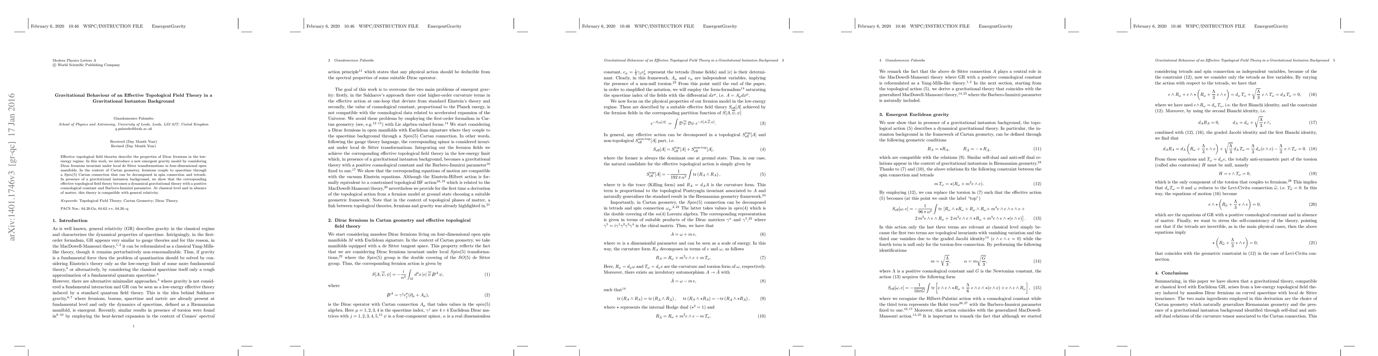 Effective topological field theories describe the properties of Dirac fermions in the low-energy regime. In this work, we introduce a new emergent gravity model by considering Dirac fermions invariant under local de Sitter transformations in four-dimensional open manifolds. In the context of Cartan geometry, fermions couple to spacetime through a $Spin(5)$ Cartan connection that can be decomposed in spin connection and tetrads. In presence of a gravitational instanton background, we show that the corresponding effective topological field theory becomes a dynamical gravitational theory with a positive cosmological constant and Barbero-Immirzi parameter. At classical level and in absence of matter, this theory is compatible with general relativity.