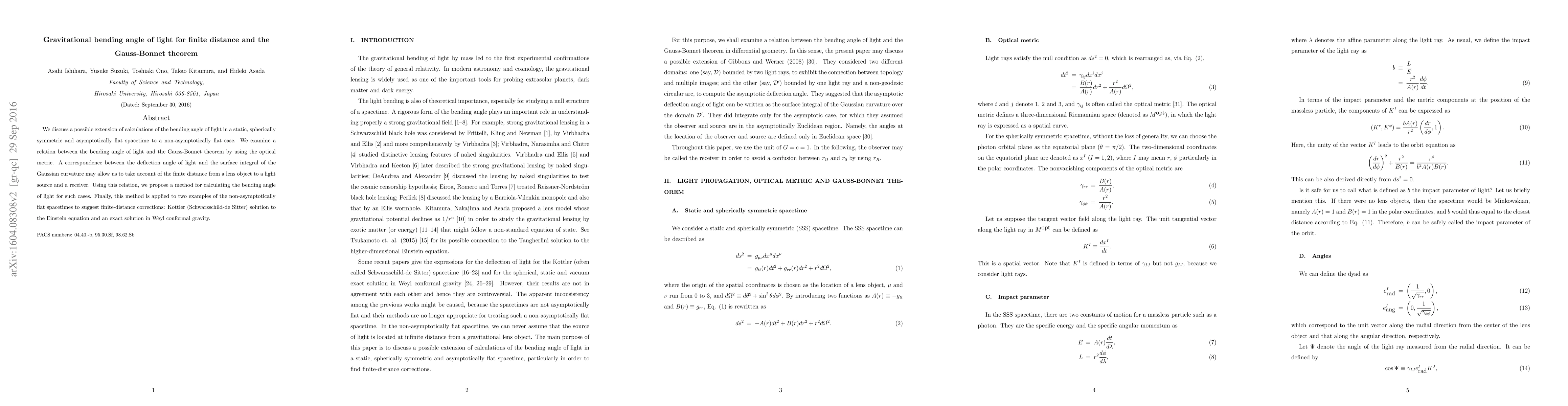 We discuss a possible extension of calculations of the bending angle of light in a static, spherically symmetric and asymptotically flat spacetime to a non-asymptotically flat case. We examine a relation between the bending angle of light and the Gauss-Bonnet theorem by using the optical metric. A correspondence between the deflection angle of light and the surface integral of the Gaussian curvature may allow us to take account of the finite distance from a lens object to a light source and a receiver. Using this relation, we propose a method for calculating the bending angle of light for such cases. Finally, this method is applied to two examples of the non-asymptotically flat spacetimes to suggest finite-distance corrections: Kottler (Schwarzschild-de Sitter) solution to the Einstein equation and an exact solution in Weyl conformal gravity.