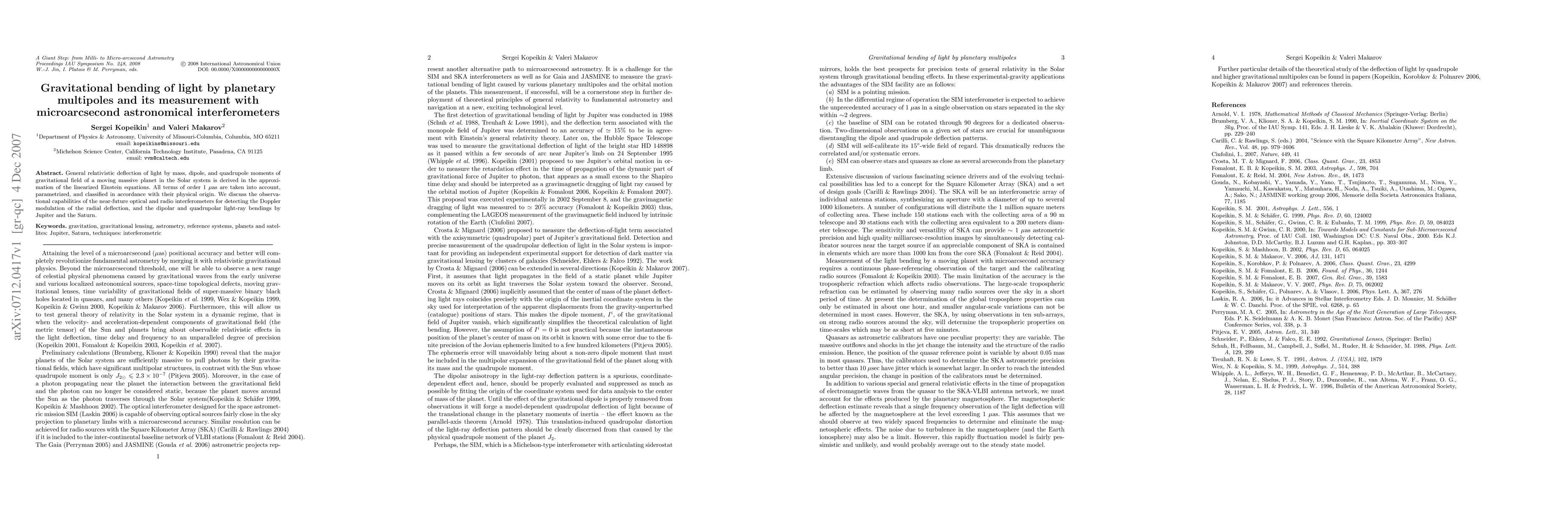 General relativistic deflection of light by mass, dipole, and quadrupole moments of gravitational field of a moving massive planet in the Solar system is derived in the approximation of the linearized Einstein equations. All terms of order 1 microarcsecond are taken into account, parametrized, and classified in accordance with their physical origin. We discuss the observational capabilities of the near-future optical and radio interferometers for detecting the Doppler modulation of the radial deflection, and the dipolar and quadrupolar light-ray bendings by Jupiter and the Saturn.