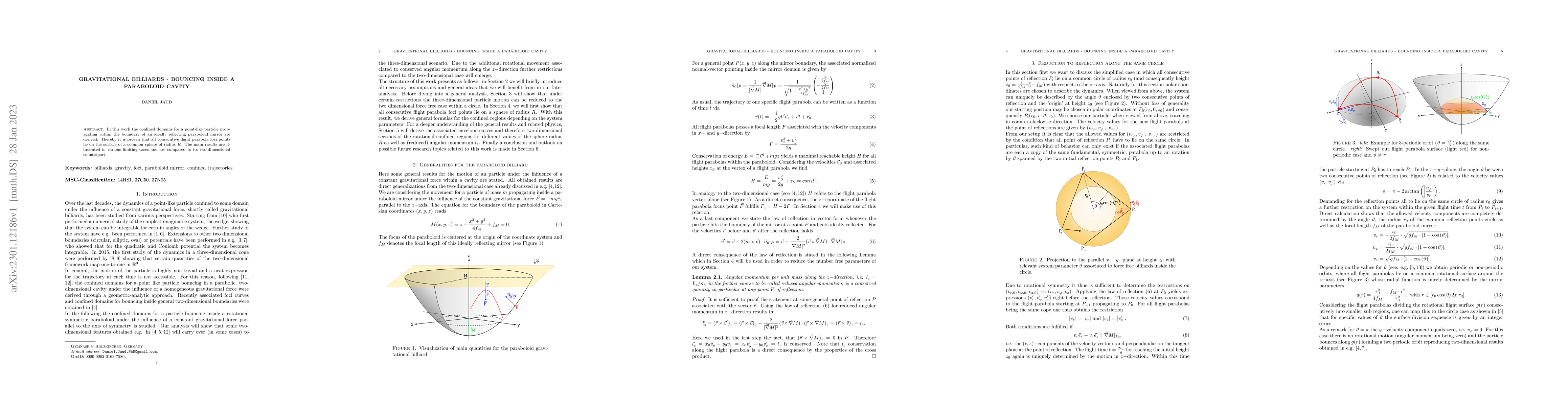 This paper derives the confined trajectories of a point-like particle within a paraboloid mirror, proving that all flight parabola foci lie on a common sphere of radius $R$. Comparisons with the two-dimensional counterpart are provided to illustrate the main results.