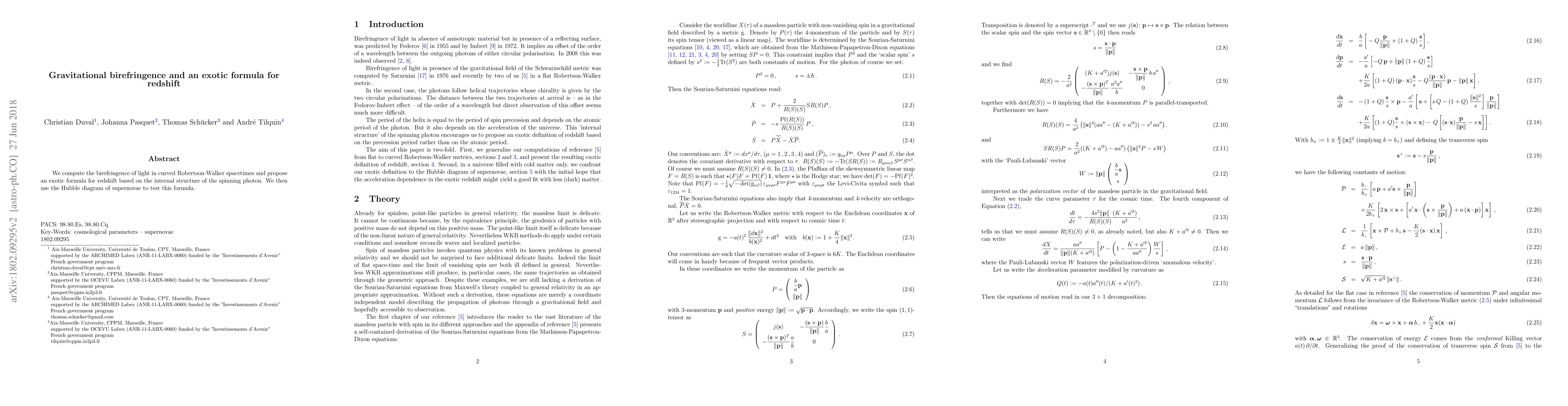 We compute the birefringence of light in curved Robertson-Walker spacetimes and propose an exotic formula for redshift based on the internal structure of the spinning photon. We then use the Hubble diagram of supernovae to test this formula.