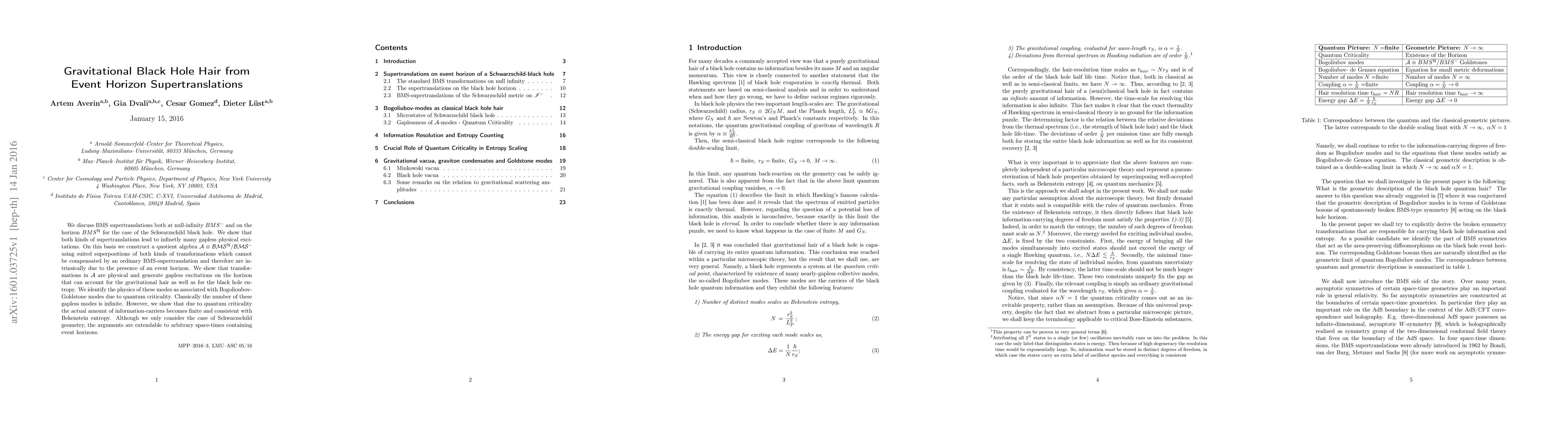 This paper explores the impact of BMS supertranslations on Schwarzschild black holes, demonstrating that these transformations generate infinitely many gapless physical excitations on the event horizon. It concludes that these excitations, akin to Bogoliubov-Goldstone modes, account for black hole entropy and gravitational "hair," with quantum criticality limiting the number of information-carriers to a finite, Bekenstein-consistent amount.
