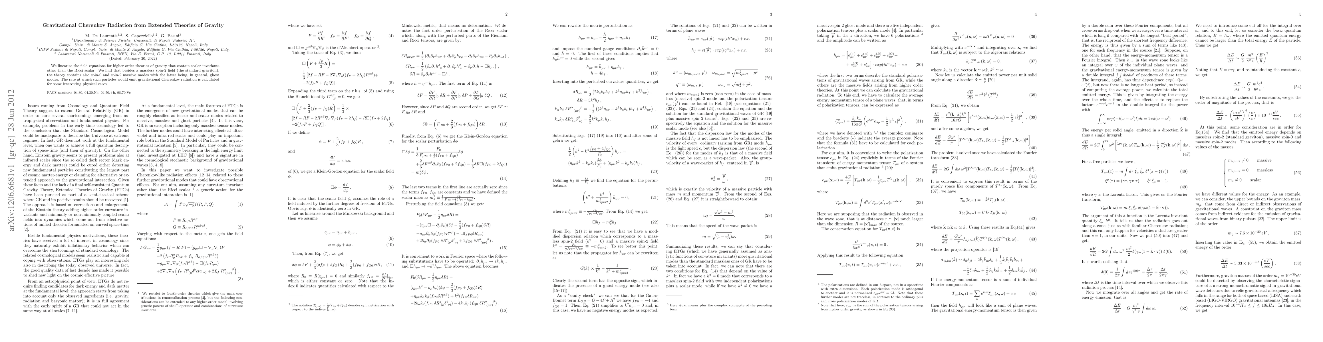This paper investigates linearized field equations in extended gravity theories beyond general relativity, revealing the presence of spin-0 and spin-2 massive modes, including potential ghost modes. It calculates the emission rate of gravitational Cherenkov radiation for these modes in various physical scenarios.