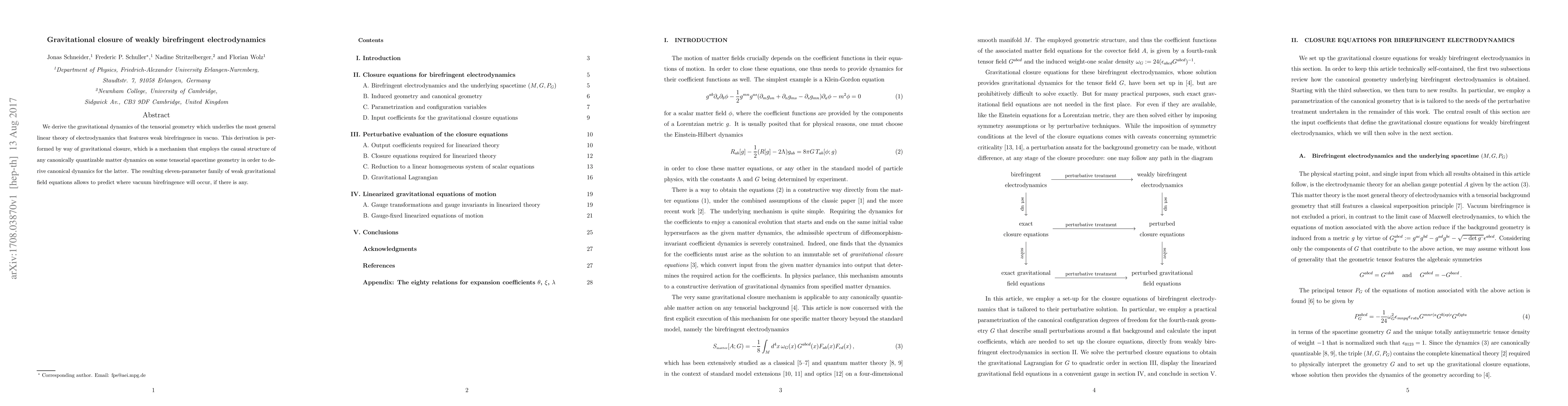We derive the gravitational dynamics of the tensorial geometry which underlies the most general linear theory of electrodynamics that features weak birefringence in vacuo. This derivation is performed by way of gravitational closure, which is a mechanism that employs the causal structure of any canonically quantizable matter dynamics on some tensorial spacetime geometry in order to derive canonical dynamics for the latter. The resulting eleven-parameter family of weak gravitational field equations allows to predict where vacuum birefringence will occur, if there is any.