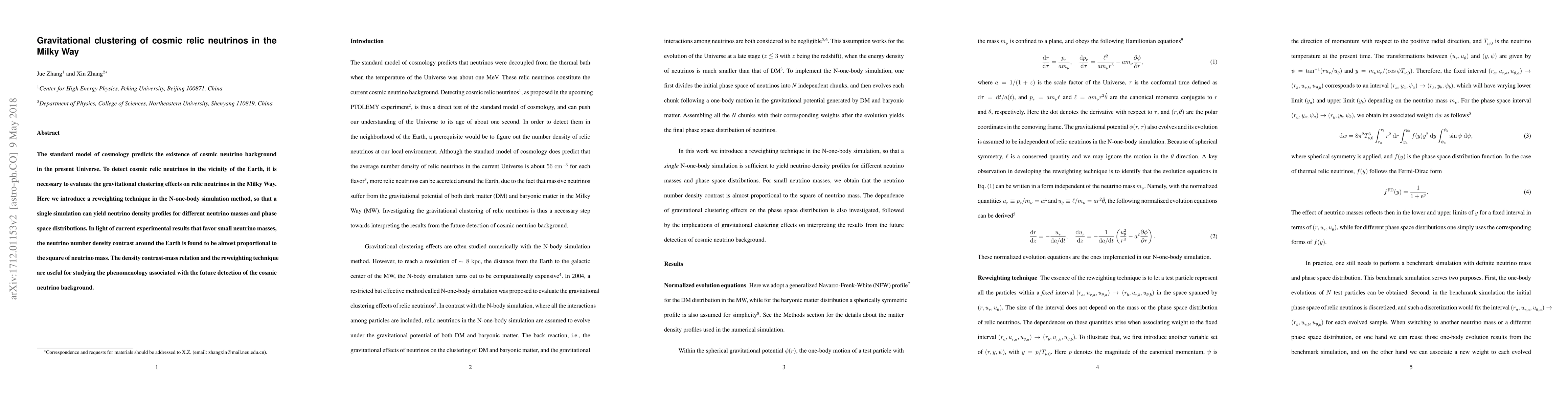 This paper introduces a reweighting technique in N-body simulations to evaluate gravitational clustering effects on cosmic relic neutrinos in the Milky Way, finding that the neutrino number density contrast is proportional to the square of neutrino mass, aiding future detection efforts. The study supports the small neutrino mass hypothesis favored by current experimental results.