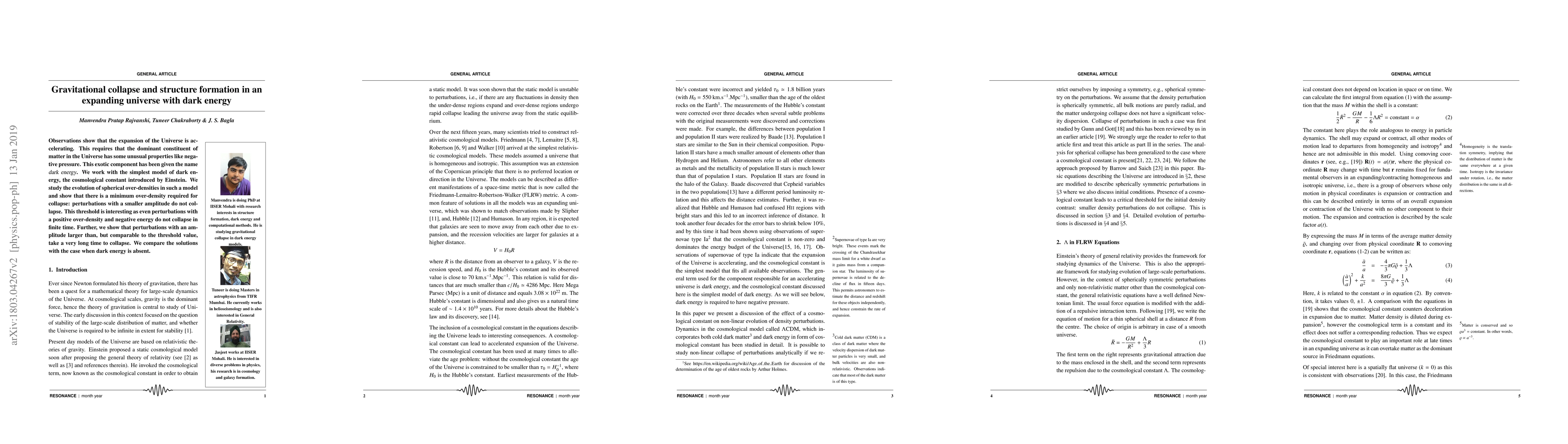 This paper explores gravitational collapse in an expanding universe with dark energy, specifically using the cosmological constant model. It finds a minimum over-density threshold for collapse, noting that even perturbations with positive over-density and negative energy fail to collapse in finite time, and larger-than-threshold perturbations take a very long time to collapse, contrasting with scenarios without dark energy.