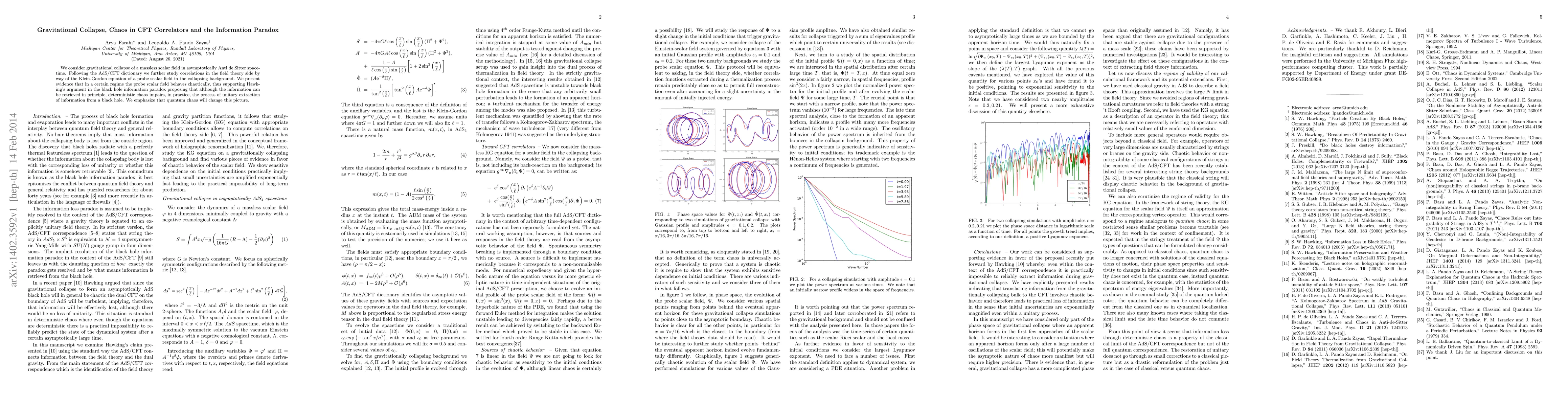 This paper explores gravitational collapse in Anti de Sitter spacetime and investigates chaotic behavior in the corresponding conformal field theory correlators using the AdS/CFT correspondence. It finds evidence of chaos in the probe scalar field, supporting Hawking's view on the information paradox, though quantum chaos may alter this conclusion.