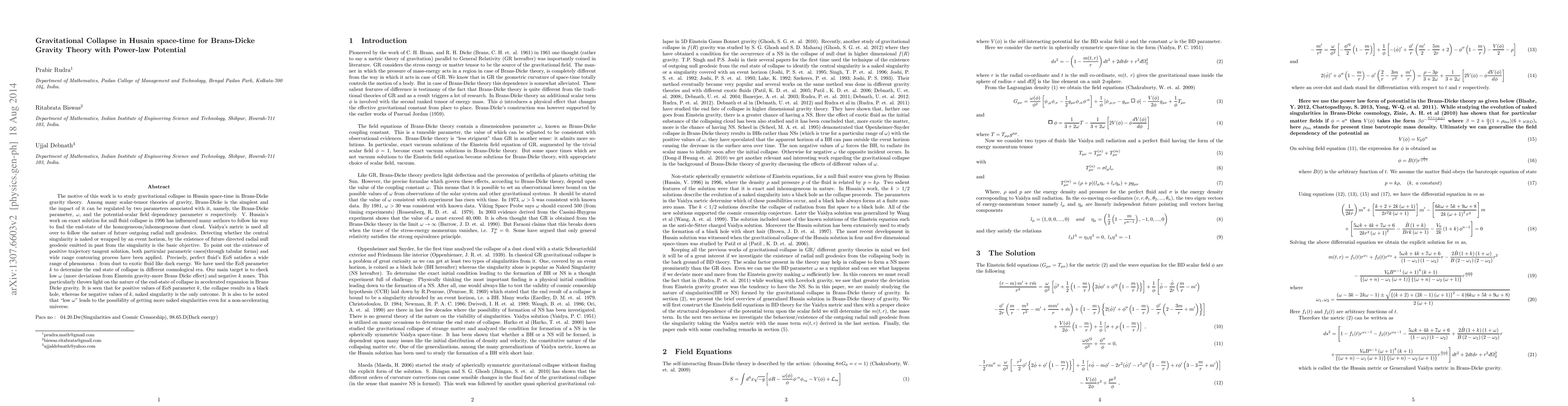 The motive of this work is to study gravitational collapse in Husain space-time in Brans-Dicke gravity theory. Among many scalar-tensor theories of gravity, Brans-Dicke is the simplest and the impact of it can be regulated by two parameters associated with it, namely, the Brans-Dicke parameter, $\omega$, and the potential-scalar field dependency parameter $n$ respectively. V. Husain's work on exact solution for null fluid collapse in 1996 has influenced many authors to follow his way to find the end-state of the homogeneous/in-homogeneous dust cloud. Vaidya's metric is used all over to follow the nature of future outgoing radial null geodesics. Detecting whether the central singularity is naked or wrapped by an event horizon, by the existence of future directed radial null geodesic emitted in past from the singularity is the basic objective. To point out the existence of positive trajectory tangent solution, both particular parametric cases(through tabular forms) and wide range contouring process have been applied. Precisely, perfect fluid's EoS satisfies a wide range of phenomena : from dust to exotic fluid like dark energy. We have used the EoS parameter $k$ to determine the end state of collapse in different cosmological era. Our main target is to check low $\omega$ (more deviations from Einstein gravity-more Brans Dicke effect) and negative $k$ zones. This particularly throws light on the nature of the end-state of collapse in accelerated expansion in Brans Dicke gravity. It is seen that for positive values of EoS parameter $k$, the collapse results in a black hole, whereas for negative values of $k$, naked singularity is the only outcome. It is also to be noted that "low $\omega$" leads to the possibility of getting more naked singularities even for a non-accelerating universe.