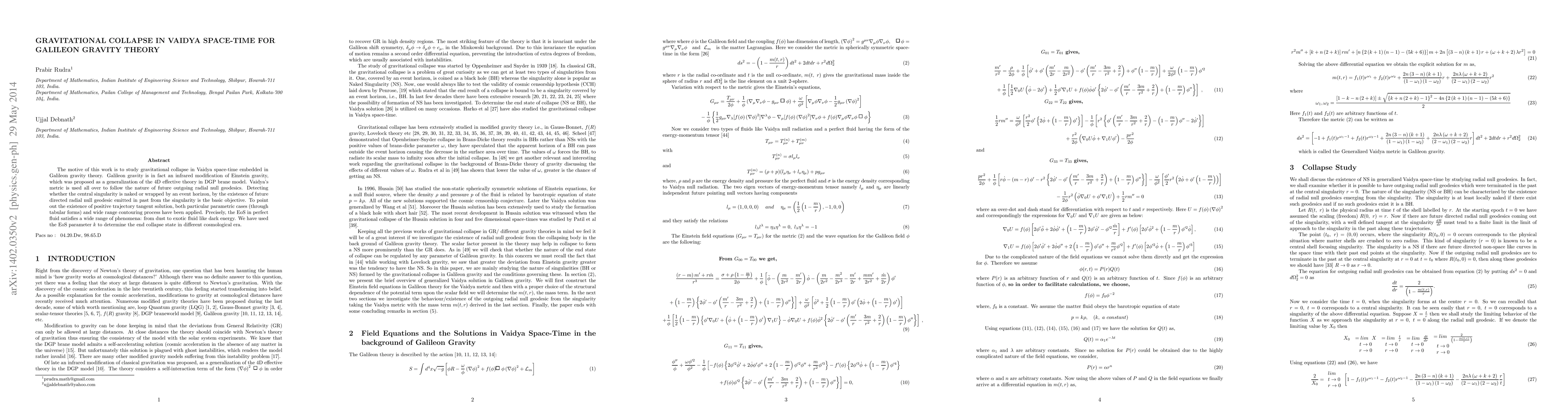 The motive of this work is to study gravitational collapse in Vaidya space-time embedded in Galileon gravity theory. Galileon gravity is in fact an infrared modification of Einstein gravity, which was proposed as a generalization of the 4D effective theory in DGP brane model. Vaidya's metric is used all over to follow the nature of future outgoing radial null geodesics. Detecting whether the central singularity is naked or wrapped by an event horizon, by the existence of future directed radial null geodesic emitted in past from the singularity is the basic objective. To point out the existence of positive trajectory tangent solution, both particular parametric cases (through tabular forms) and wide range contouring process have been applied. Precisely, the EoS in perfect fluid satisfies a wide range of phenomena: from dust to exotic fluid like dark energy. We have used the EoS parameter $k$ to determine the end collapse state in different cosmological era.
